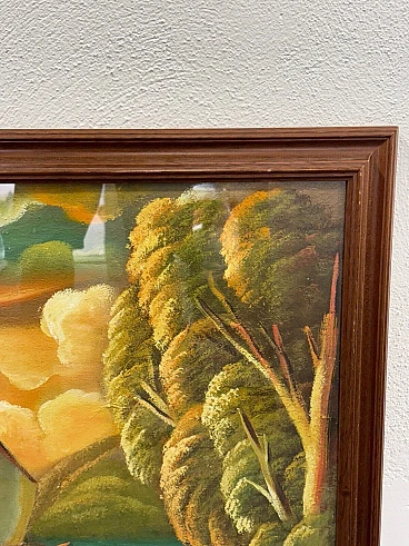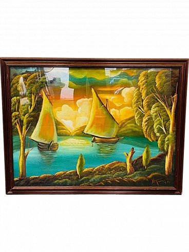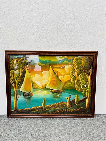 Fiume con barche a vela, dipinto a tecnica mista su tela, anni '70