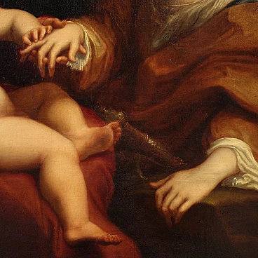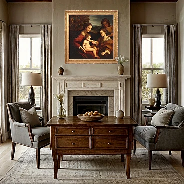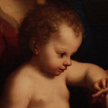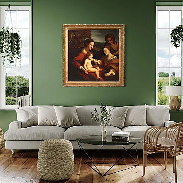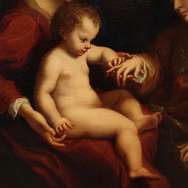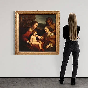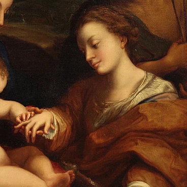 Grande dipinto italiano della prima metà del '600. Opera a olio su tela attribuibile a un seguace del celebre pittore Antonio Allegri detto il Correggio (1489-1534). Quadro di notevole qualità pittorica in quanto copia di altissima qualità del Matrimonio mistico di Santa Caterina d'Alessandria alla presenza di San Sebastiano, oggi esposto al Louvre di Parigi. Di tutte le versioni che il Correggio aveva dato di questo tema nel corso della sua carriera artistica, questa è una delle più eleganti e raffinate. La leggenda racconta che, dopo essere stata battezzata, la giovane abbia avuto una visione. Le apparvero la Madonna con in grembo il bambino Gesù, il quale infilò al dito di Caterina un anello, facendola sua sposa. Il fulcro del dipinto è rappresentato dalle mani della Vergine, del bambino e di Santa Caterina. Infatti tutti gli sguardi convergono verso questo fulcro affettivo, incluso quello di San Sebastiano. Da notare sullo sfondo di sinistra la scena del martirio del Santo. Cornice antica non coeva in legno scolpito e dorato, di grande decorazione, con alcune cadute di doratura (vedi foto). Opera che ha subito un intervento di restauro con rintelo, sostituzione del telaio e ripresa del colore in piccoli punti. Nel complesso in ottimo stato conservativo. Misure senza cornice: 102 x 102 cm.