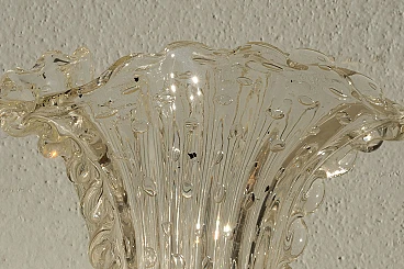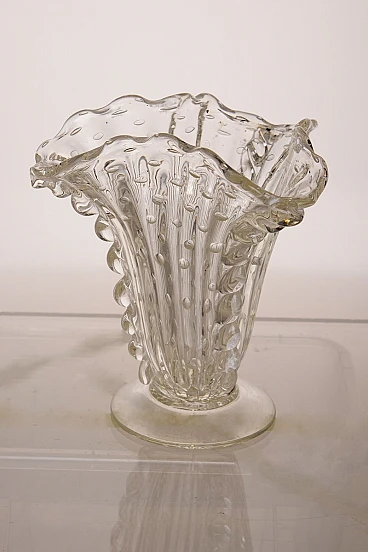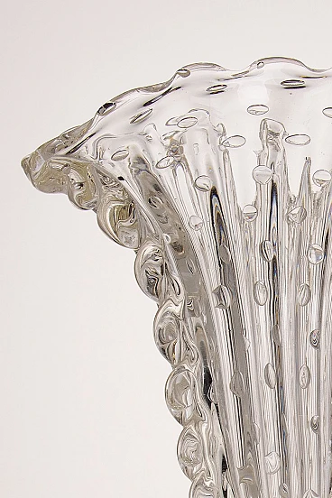 Vaso a forma di ventaglio in vetro cristallo Veneziano con particolare effetto decorativo (“Bullicante” gergo veneziano) utilizzato dai vetrai muranesi, che consiste in delle piccole bolle d’aria che vengono immerse nel vetro. Questo vaso è arricchito da applicazioni laterali che consistono in cordoncini di vetro sagomato dal caratteristico andamento ondulato, in gergo veneziano vengono chiamate “morise”. Il vaso, realizzato nelle officine Muranesi di Barovier & Toso negli anni '30 - '40 circa, presenta delle piccole particelle di cenere immerse nel vetro, dovute alla lavorazione e precisamente formatesi durante la fase di cottura del vaso, che sono da considerarsi valore aggiunto della lavorazione artigianale.