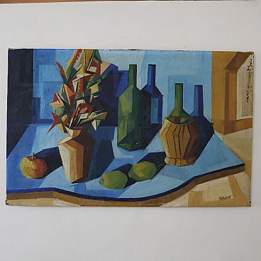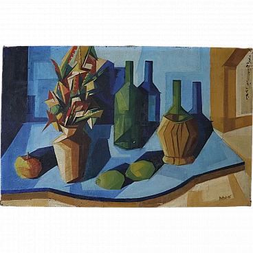 Questo quadro del 1956 è un'opera affascinante che cattura l'essenza della natura morta attraverso l'interpretazione unica del movimento cubista. Dipinta su tela, l'opera si distingue per l'uso audace di forme geometriche e colori vibranti, caratteristici di questo movimento artistico rivoluzionario. La data 1956 riportata sul retro aggiunge un valore storico e autentico a questa opera d'arte, rivelando il periodo in cui è stata creata e contribuendo alla sua provenienza e autenticità. Questo quadro non solo rappresenta un'espressione artistica ma anche un pezzo di storia dell'arte del '900. Le dimensioni generose lo rendono ideale come punto focale in qualsiasi ambiente domestico o professionale. La sua presenza può trasformare un muro in una galleria d'arte personale, aggiungendo profondità e fascino a qualsiasi spazio.