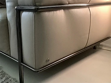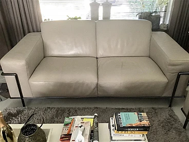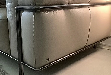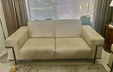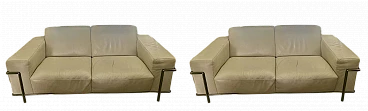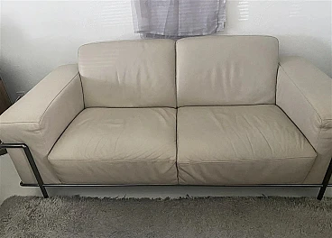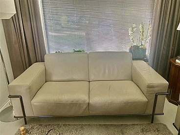 Coppia di eleganti divani Club 2 in stile modernista francese. Di Centro Studi Natuzzi. In buone condizioni. La versione rivista della serie LC2 disegnata a tre mani da: Le Corbusier, Pierre Jeanneret e Charlotte Perriand, alla fine degli anni 20 del XX secolo, prodotta da Natuzzi. Collezione di alta gamma Natuzzi. Altissima qualità di lavorazione, accurata selezione delle materie prime. Rivestimento in morbidissima pelle (primo fiore), di colore crema, con struttura tubolare in acciaio tipo Mannesman con finitura cromata. I sedili sono confortevoli. La pelle è in buonissimo stato, cromature ok. Ci sono leggerissimi segnettini e qualche piegatura sul pellame. Per il resto sono a posto. Un set di due bellissimi e comodissimi divani dalle generose dimensioni, dotati di braccioli Ampi e comodi. Collezione di Alta Gamma Natuzzi. Prezzo della coppia nuova 10000 euro. Larghezza 200 cm, profondità 92 cm, altezza 76-80 cm, altezza della seduta 40 cm.