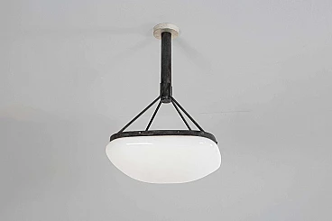 In tutto il negozio, allestimenti progettati su misura testimoniano la sensibilità dello Studio B.B.P.R. per il design espositivo e la presentazione di oggetti, l'esperienza affinata attraverso la mostra di design industriale La forma dell'utile alla Triennale di Milano del 1951 e le flessibili gallerie museali sviluppate dal gruppo per la contemporanea ristrutturazione del Castello Sforza, a Milano. Una serie di vetrine autoportanti in vetro con cornici in ottone brunito incoraggiavano gli acquirenti a esaminare i prodotti a tutto tondo, mentre i pannelli murali rimovibili in legno consentivano di nascondere o riconfigurare le numerose vetrine incassate posizionate strategicamente in tutto il negozio per soddisfare le diverse esigenze di merchandising. A un'estremità del lungo bancone fotografico, un pannello ovoidale retroilluminato integrato nella superficie creava un tavolo luminoso interattivo che aiutava gli utenti a dare un'occhiata più da vicino ai propri negativi o diapositive. Queste plafoniere progettate su misura erano un motivo di design distintivo degli interni così come degli esterni di Ottica Randazzo. Appesi in file ordinate, gli apparecchi non solo creavano un ambiente luminoso, fondamentale per i clienti che ispezionavano un costoso apparecchio ottico o strizzavano gli occhi su una tabella per una visita oculistica, ma la loro geometria sottile trasmetteva anche l'essenza della raffinata interpretazione del Razionalismo dello Studio B.B.P.R. Le tonalità morbidamente squadrate delle luci riecheggiavano la griglia rettilinea dei pannelli di legno d'ulivo (anch'essa simile a un foglio di contatto fotografico), e la regolarità del loro posizionamento ogni due pannelli lungo il soffitto forniva un ritmo ritmico a un interno che nuotava con i dinamici motivi naturali di legno e pietra. Significative anche le luci di Randazzo che mostrano lo Studio B.B.P.R. lavorando su una scala più ampia rispetto ai precedenti progetti di illuminazione (una considerazione funzionale, data la loro applicazione in un ambiente di vendita al dettaglio), e inaugurano un periodo di design più espressivo per il gruppo, comprese opere come la serie 2045 di soffitti circolari raggruppati luci montate del 1962. In linea con l'approccio modulare agli interni, lo Studio B.B.P.R. ha progettato diverse varianti delle luci da utilizzare all'interno di zone specifiche del negozio. Tutti sono stati costruiti attorno alla forma quadrata e rilassata del paralume convesso: l'esempio attuale, montato lungo l'asse centrale dello showroom e all'interno del vestibolo d'ingresso, una versione con un tubo obliquo più lungo che pendeva più in basso sopra il bancone fotografico per portare lo spazio a misura d'uomo, e una versione che si trovava a filo con i soffitti più bassi nel reparto ottico e negli uffici sotterranei. Ognuna delle due dozzine e rotti luci in ottone e acrilico è stata realizzata a mano da Piero Frigerio e Aldo Galimberti, artigiani con sede nella città di Cantu`, nel nord Italia, e abili fabbricanti con cui il gruppo ha lavorato a lungo nella produzione di molti di i suoi articoli di custodia. I sofisticati interni di Ottica Randazzo dello Studio B.B.P.R sono rimasti intatti per quasi 30 anni. Verso la fine degli anni '80, la tecnologia di elaborazione fotografica era avanzata e il negozio fu ampliato grazie a un'accurata ristrutturazione operata dall'architetto locale Roberto Collova`, che conservò gran parte del carattere e dell'intento originali ma vide la rimozione degli apparecchi di illuminazione su misura. Un successivo intervento dello Studio di Santis nel 2007 ha trasformato completamente lo spazio, eliminando ogni traccia dell'edificio dello Studio B.B.P.R. design, compreso il caratteristico vestibolo d'ingresso del pubblico, i pavimenti e le vetrine. La ristrutturazione ha suscitato un dibattito pubblico sulle pagine de La Repubblica sul ruolo dell'architettura moderna e ha scatenato una protesta da parte dei più accesi ambientalisti palermitani, per i quali Randazzo rappresentava non solo l'orgogliosa eredità del design italiano del dopoguerra al suo apice, ma un personaggio amato sul paesaggio urbano della città, impegnata in uno scambio quotidiano con i suoi concittadini. L'oggetto è stato restaurato. Era con neon e l'ho ricablato con lampadine normali. Dispongo di foto e documentazione della lavorazione, inoltre la coppa in alluminio che vedete nelle foto non è originale ma messa per tenere il lampadario sotto la chiusura in legno del negozio di Randazzo.