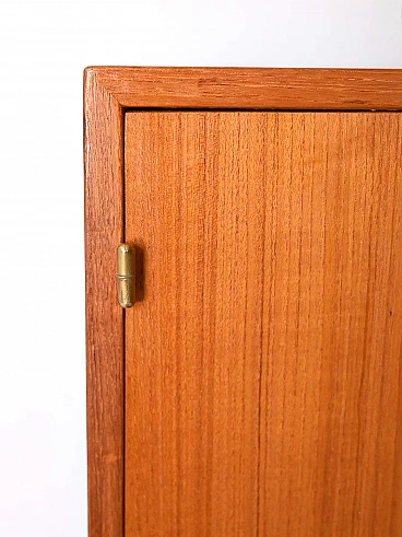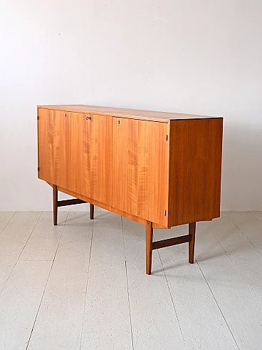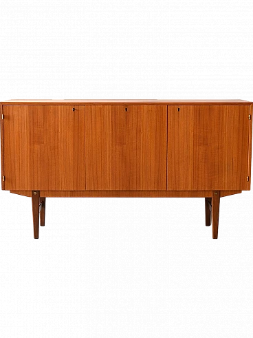Sideboard anni '60 di manifattura svedese. Questo pezzo vintage incarna la semplicità e il minimalismo tipici del modernismo nordico, rendendolo un complemento d'arredo perfetto per vari ambienti della tua casa. La credenza presenta una figura regolare e pulita costituita da tre ante a battente ognuna dotata di serratura. La spaziosa struttura offre ampio spazio di archiviazione, permettendoti di organizzare con facilità stoviglie, libri, o altri oggetti essenziali, mantenendo l'ordine e l'eleganza nel tuo spazio abitativo. Le gambe rastremate alleggeriscono visivamente la figura della credenza, donandole un aspetto slanciato e raffinato. Questa caratteristica non solo aggiunge un tocco di leggerezza al design complessivo, ma garantisce anche una solida stabilità. Il teak, con le sue calde venature naturali, conferisce alla credenza una finitura ricca e lussuosa, esaltando la qualità e l'artigianato del pezzo.