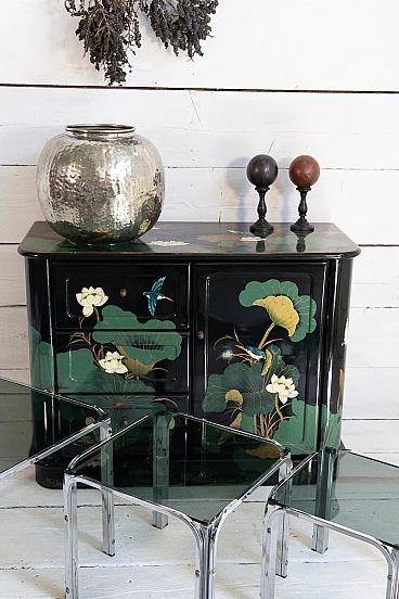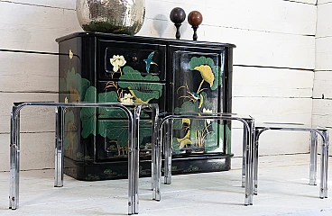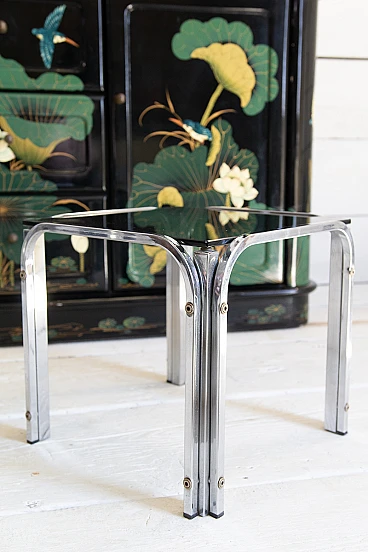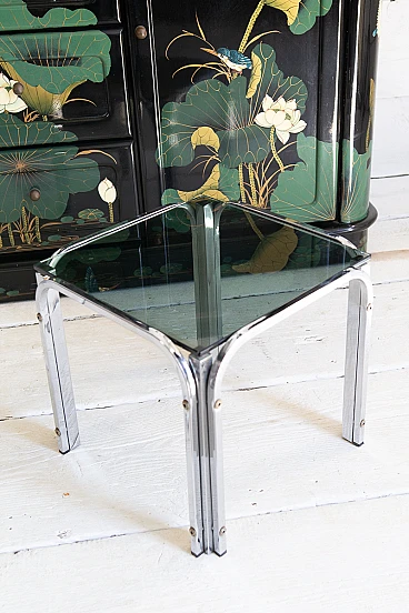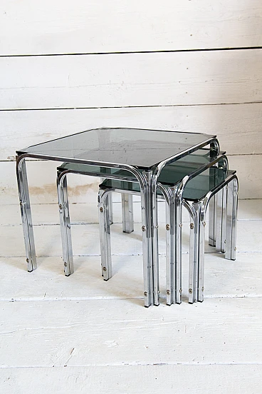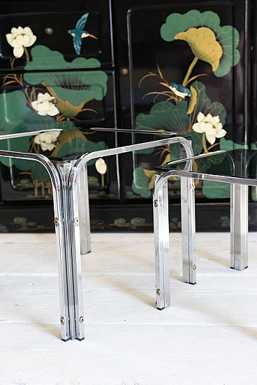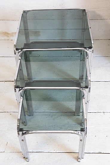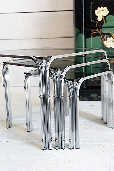 3 Tavolini a nido in metallo cromato e vetro fumé, anni '70