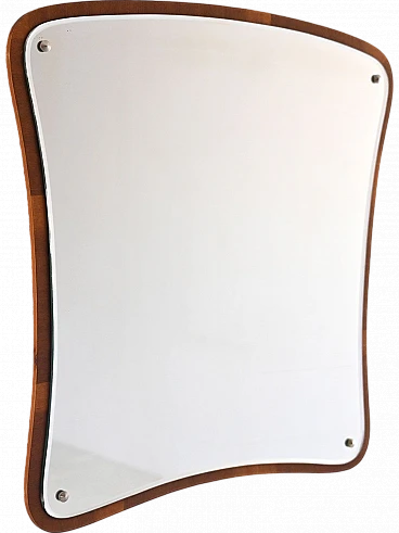 Specchio da parete scandinavo in teak, anni '60. La cornice è caratterizzata da bordi curvati che evocano le forme organiche tipiche del modernismo nordico, creando un'armonia visiva che aggiunge un tocco artistico e naturale a qualsiasi ambiente. Gli angoli dello specchio sono impreziositi da fermi in ottone che non solo offrono un dettaglio decorativo raffinato ma garantiscono anche robustezza e stabilità alla struttura. Questo specchio non è solo un accessorio pratico ma un vero e proprio pezzo di design che dona carattere e personalità alla tua casa, perfetto per il soggiorno, l'ingresso o la camera da letto. Buone condizioni. Si prega di prestare attenzione alle fotografie.