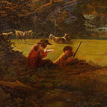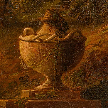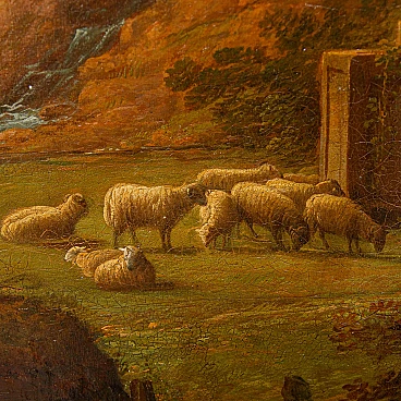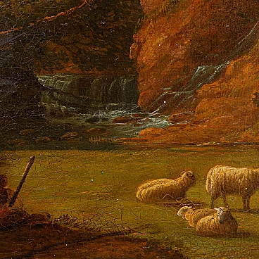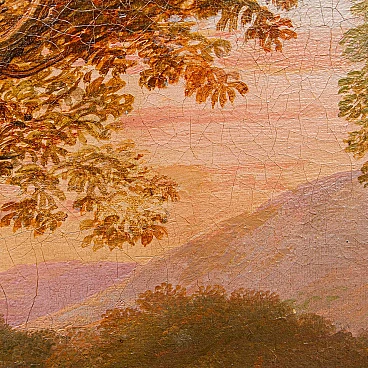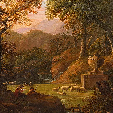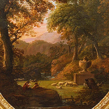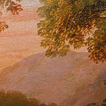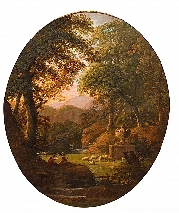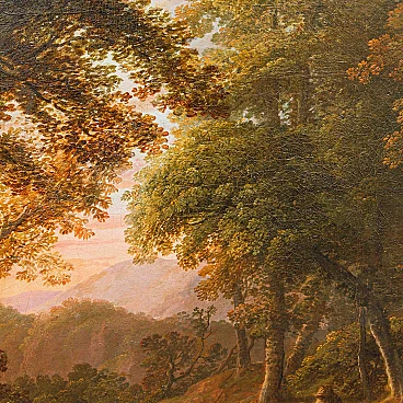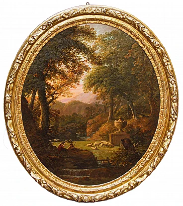 Dipinto a olio su tela raffigurante un paesaggio con figure realizzato da un seguace di Claude Lorrain, '600. Misure senza cornice: 92 x 77 cm. Claude Gellée, conosciuto come Claude Lorrain (Chamagne, 1600 circa - Roma, 1682), fu un pittore, disegnatore e incisore francese, considerato uno dei maestri indiscussi del paesaggio ideale del XVII secolo. La sua opera, caratterizzata da atmosfere serene e luminose, immerse in una natura idealizzata e spesso popolata da figure mitologiche o bibliche, ha influenzato profondamente la pittura paesaggistica per secoli a venire. Nato in Lorena, Lorrain si trasferì giovanissimo in Italia, dove trascorse la maggior parte della sua vita. A Roma, entrò a bottega presso il paesaggista Agostino Tassi e si dedicò allo studio approfondito della natura, traendo ispirazione dalle campagne romane e dai dintorni della città. La sua fama crebbe rapidamente e ben presto divenne uno degli artisti più richiesti dai collezionisti e dai mecenati dell'epoca. I paesaggi di Lorrain si distinguono per la loro armonia compositiva, l'uso sapiente della luce e la resa magistrale degli effetti atmosferici. Le sue tele sono spesso caratterizzate da una prospettiva aerea che dilata lo spazio e invita lo sguardo ad addentrarsi in una natura idealizzata, dove rovine classiche, templi antichi e figure mitologiche si fondono in una visione poetica ed evocativa. L'opera di Claude Lorrain ha avuto un'influenza profonda sulla pittura paesaggistica successiva. Artisti come Nicolas Poussin, Gaspard Dughet e Alexander Cozens ripresero i suoi temi e la sua tecnica, contribuendo a diffondere il genere del paesaggio ideale in tutta Europa. Ed è proprio l’atmosfera idilliaca e serena del paesaggio, illuminata da una luce dorata e calda, che crea un'atmosfera suggestiva e avvolgente che collega il presente alla produzione di un seguace di Claude Lorrain. Si vedano a raffronto opere come il Paesaggio del Museo Thyssen-Bornemisza, Apollo e le greggi di Admeto di Collezione privata o ancora Enea che caccia il cervo del Museo Nazionale di Belle Arti del Belgio.