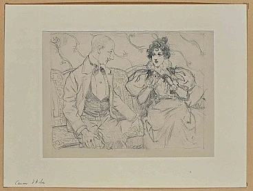 Una coppia sul divano è un disegno a matita originale realizzato da Caran D'Ache (1858-1909) alla fine del XIX secolo.Buone condizioni su cartoncino grigio incluso un passpartout in cartoncino blu (24,5x31 cm).Firma su lastra.Caran d'Ache era lo pseudonimo del fumettista satirico e politico francese del XIX secolo Emmanuel Poiré (6 novembre 1858 – 25 febbraio 1909). Lo pseudonimo deriva dal russo: ????????, romanizzato: karandash che significa "matita" nelle lingue turche. Mentre la sua prima opera glorificava l'epoca napoleonica, continuò a creare "storie senza parole" e come collaboratore di giornali come Le Figaro, è talvolta acclamato come uno dei precursori dei fumetti. L'azienda svizzera di prodotti d'arte Caran d'Ache porta il suo nome. Colleziona una bellissima opera d'arte del XIX secolo!