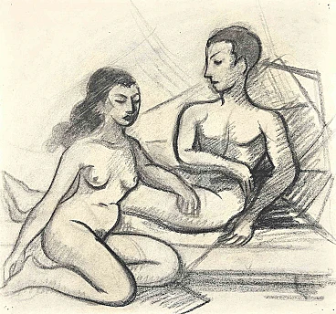 Coppia è un disegno originale a matita, realizzato nella metà del XX secolo da Jean Delpech (1916-1988). Buone condizioni. Jean-Raymond Delpech (1988-1916) è un pittore, incisore e illustratore francese, che è maggiormente influenzato dal paese della sua infanzia. ha studiato alla Scuola di Belle Arti di Parigi. Vinse il primo premio di Roma per l'incisione calcografica nel 1948, ottenendo poi molto successo in Italia. Ha prodotto anche francobolli, illustrazioni per libri e riviste, scenografie teatrali (per Dullin), medaglie, dipinti e persino vetrate. Dal 1944 al 2004, il suo lavoro è stato oggetto di numerose mostre, individuali o collettive.
