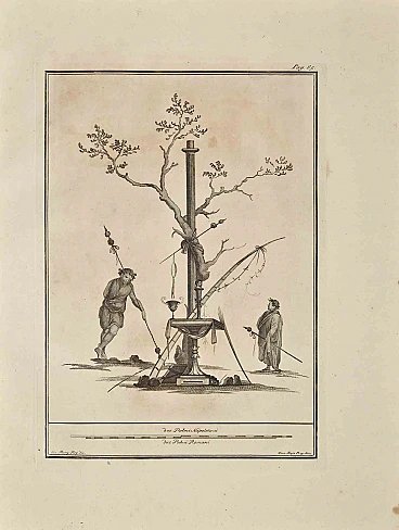 L'antico affresco romano della serie "Antichità di Ercolano", è un'originale acquaforte su carta realizzata da Giovanni Morghen nel XVIII secolo. Firmato sulla targa. Buone condizioni ad eccezione di alcune piccole macchie e foxing. L'acquaforte appartiene alla suite di stampe “Antichità di Ercolano Esposte” (titolo originale: “Le Antichità di Ercolano Esposte”), un volume in otto volumi di incisioni dei reperti provenienti dallo scavo degli scavi di Ercolano nel Regno di Napoli ( ora Campania, Italia). Fu pubblicato tra il 1757 e il 1792 dalla Regia Stamperia e le copie furono consegnate a destinatari selezionati in tutta Europa. Nonostante il titolo, le Antichità di Ercolano riportano oggetti provenienti da tutti gli scavi intrapresi dai Borboni nel Golfo di Napoli. Questi includono Pompei, Stabia e due siti di Ercolano: Resina e Portici. Il re Carlo di Borbone nominò quindici studiosi creando una nuova “Accademia Ercolanese” per studiare i reperti e pubblicare i risultati degli scavi archeologici dei siti. Le incisioni sono di alta qualità e il testo di accompagnamento mostra un'ampia borsa di studio. Furono realizzati da 25 artisti di spicco coinvolti dal Re nella preparazione di disegni e incisioni sui reperti, tra i quali possiamo trovare Giovanni Elia Morghen, Carlo Nolli, Luigi Vanvitelli e Giovanni Battista Casanova. Il libro “Antichità” è stato pensato più per stupire i lettori con la qualità degli oggetti della collezione del Re di Napoli che da destinare alla ricerca, seguendo e incrementando l'interesse della società del Settecento per la cultura classica e l'Arte in particolare. Attraverso l'esaltazione del concetto classico di proporzioni e armonia , il libro fu di ispirazione al movimento neoclassico in Europa, dando ad artisti e decoratori l'accesso a un vasto negozio di motivi ellenistici. Rif.: National Gallery (Washington), Mark J. Millard Architectural, IV (2000), n. 1; L. Garcia y Garcia, Nova bibliotheca pompeiana (2 v., 1998); Royal Institute of British Architects, British Architectural Library ... Primi libri stampati, 1 (1994), n. 112. U. Pannuti, 'Incisori e disegnatori della Stamperia Reale di Napoli nel secolo XVIII: la pubblicazione delle Antichità di Ercolano', in Xenia antiqua, 9 (2000), p. 151-178; V. Trombetta, 'L'edizione de Le Antichità di Ercolano esposte' in Rendiconti dell'Accademia di Archeologia, lettere e belle arti di Napoli, 59 (1984), p.151-172.