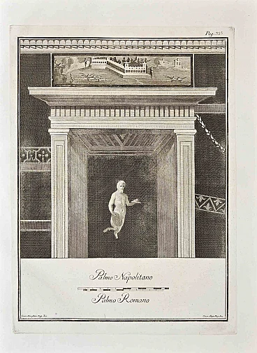 L'antico affresco romano della serie "Antichità di Ercolano", è un'originale acquaforte su carta realizzata da Giovanni Morghen nel XVIII secolo. Firmato sulla targa. Buone condizioni ad eccezione di alcune piccole macchie e un taglio sulla parte. L'acquaforte appartiene alla suite di stampe “Antichità di Ercolano Esposte” (titolo originale: “Le Antichità di Ercolano Esposte”), un volume in otto volumi di incisioni dei reperti provenienti dallo scavo degli scavi di Ercolano nel Regno di Napoli ( ora Campania, Italia). Fu pubblicato tra il 1757 e il 1792 dalla Regia Stamperia e le copie furono consegnate a destinatari selezionati in tutta Europa. Nonostante il titolo, le Antichità di Ercolano riportano oggetti provenienti da tutti gli scavi intrapresi dai Borboni nel Golfo di Napoli. Questi includono Pompei, Stabia e due siti di Ercolano: Resina e Portici. Il re Carlo di Borbone nominò quindici studiosi creando una nuova “Accademia Ercolanese” per studiare i reperti e pubblicare i risultati degli scavi archeologici dei siti. Le incisioni sono di alta qualità e il testo di accompagnamento mostra un'ampia borsa di studio. Furono realizzati da 25 artisti di spicco coinvolti dal Re nella preparazione di disegni e incisioni sui reperti, tra i quali possiamo trovare Giovanni Elia Morghen, Carlo Nolli, Luigi Vanvitelli e Giovanni Battista Casanova. Il libro “Antichità” è stato pensato più per stupire i lettori con la qualità degli oggetti della collezione del Re di Napoli che da destinare alla ricerca, seguendo e incrementando l'interesse della società del Settecento per la cultura classica e l'Arte in particolare. Attraverso l'esaltazione del concetto classico di proporzioni e armonia , il libro fu di ispirazione al movimento neoclassico in Europa, dando ad artisti e decoratori l'accesso a un vasto negozio di motivi ellenistici. Rif.: National Gallery (Washington), Mark J. Millard Architectural, IV (2000), n. 1; L. Garcia y Garcia, Nova bibliotheca pompeiana (2 v., 1998); Royal Institute of British Architects, British Architectural Library ... Primi libri stampati, 1 (1994), n. 112. U. Pannuti, 'Incisori e disegnatori della Stamperia Reale di Napoli nel secolo XVIII: la pubblicazione delle Antichità di Ercolano', in Xenia antiqua, 9 (2000), p. 151-178; V. Trombetta, 'L'edizione de Le Antichità di Ercolano esposte' in Rendiconti dell'Accademia di Archeologia, lettere e belle arti di Napoli, 59 (1984), p.151-172.