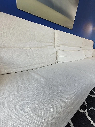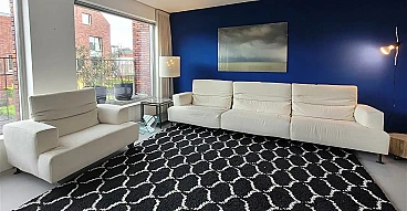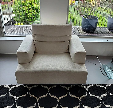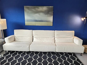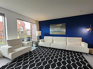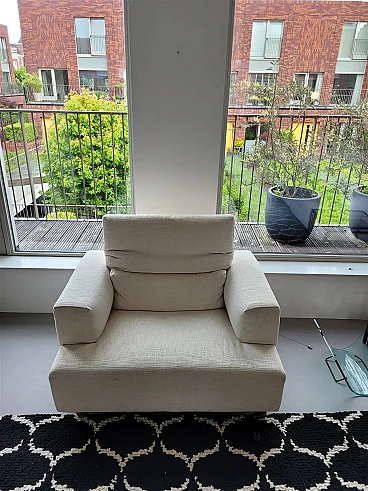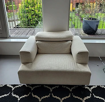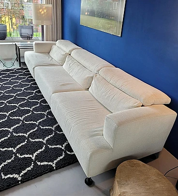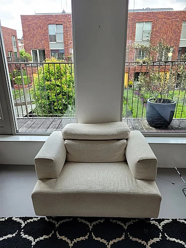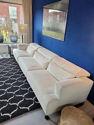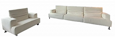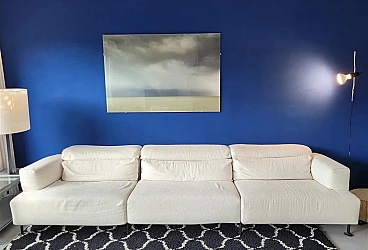Set Aire 190 di Cassina composto da divano a tre posti con poltrona XL in tessuto in cotone Canape Bianco. Elegante set da salotto dalle generose dimensioni. Massima combinazione di stile e comfort con divano per comodi tre posti a sedere e poltrona XL da 100 cm. Serie confortevolissima, grazie alle copiose morbide imbottiture, disegnata dal grande e poliedrico Piero Lissoni. Buonissimo stato. Minimi segni, due piccole macchie una sul divano e una sulla poltrona. Set acquistato nel 2014 e utilizzato da una famiglia di manager composta da 2 persone per una casa delle vacanze ad Aalborg, in Danimarca. La maggior parte del divano è ancora di ottima qualità. Solo un po' di usura sul lato sinistro. Il lato sinistro del divano è un po' usurato e soffice e quindi sembra un po' meno bianco. Il resto del divano è come nuovo. C'è una macchia sulla poltrona e una sul divano, ma sono sicuro che sia così. Entrambi i mobili sono realizzati con una rivoluzionaria struttura allungata in tubi d'acciaio di alta qualità e tessuti tecnici, accuratamente tesi da uno speciale sistema di sospensione. L'elegante struttura è avvolta in un lussuoso rivestimento in poliestere e comprende sezioni di imbottitura in poliuretano espanso strategicamente posizionate per un perfetto comfort di seduta. Il divano e le poltrone Cassina Aire non sono solo piacevoli alla vista, ma anche altamente funzionali. Il rivestimento sfoderabile in tessuto a tramatura materica a rilievo in cotone Canapone in bianco (Canape Bianco). Il poggiatesta regolabile con 2 posizioni (alta e bassa) nello schienale offre un comfort personalizzato, sia da seduti che da sdraiati. Le eleganti gambe in acciaio conferiscono al divano un aspetto moderno. La poltrona è dotata di ruote anteriori che ne facilitano lo spostamento. Poltrona (prezzo nuovo € 3850): larghezza 110 cm, profondità 99 cm, altezza 87 cm, H/S 44 cm. Divano (prezzo nuovo 10850 euro): larghezza 330 cm, profondità 44 cm, altezza 87 cm H/S 44 cm.