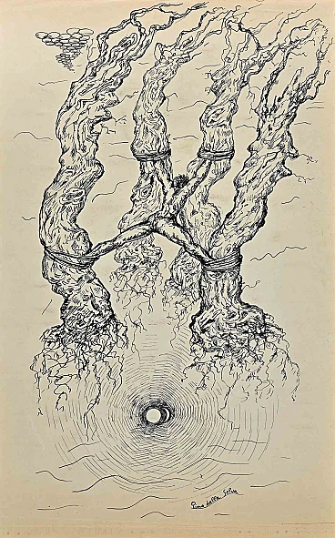 La composizione è un disegno originale a inchiostro di china realizzato da Pino della Selva (1904-1991). Buone condizioni su carta ingiallita. Firmato a mano dall'artista in basso a destra. Pino della Selva (pseudonimo di Giuseppe Giuffrida) è un pittore, scultore, disegnatore e incisore (acquaforte e xilografia), anche poeta e critico d'arte, nato il 22 giugno 1904 a Catania (Sicilia), stabilitosi a Parigi nel 1931 (abitava al 31, rue La Bruyère), e morto il 12 gennaio 1991 a Marsiglia. La sua opera pittorica, che in un primo periodo si orienta verso temi di carattere sociale (Ciechi al lavoro nel 1925, Operai nel 1932) paragonabili a quelli dei francesi Édouard Pignon e André Fougeron, si posiziona poi nella continuità del simbolismo e Il surrealismo, osserva Gino Raya, nella sua monografia dedicata al nostro artista, un mestiere pittorico realistico dove si avvertono le deformazioni sollecitate dall'onirismo, anche dalle allucinazioni. Colleziona una bellissima opera d'arte del XX secolo!