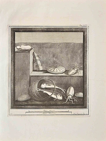 L'antico affresco romano della serie "Antichità di Ercolano", è un'originale acquaforte su carta realizzata da Francesco Cepparoli nel XVIII secolo. Firmato sulla targa. Buone condizioni ad eccezione di alcune piccole macchie e di un taglio nella parte inferiore. L'acquaforte appartiene alla suite di stampe “Antichità di Ercolano Esposte” (titolo originale: “Le Antichità di Ercolano Esposte”), un volume in otto volumi di incisioni dei reperti provenienti dallo scavo degli scavi di Ercolano nel Regno di Napoli ( ora Campania, Italia). Fu pubblicato tra il 1757 e il 1792 dalla Regia Stamperia e le copie furono consegnate a destinatari selezionati in tutta Europa. Nonostante il titolo, le Antichità di Ercolano riportano oggetti provenienti da tutti gli scavi intrapresi dai Borboni nel Golfo di Napoli. Questi includono Pompei, Stabia e due siti di Ercolano: Resina e Portici. Il re Carlo di Borbone nominò quindici studiosi creando una nuova “Accademia Ercolanese” per studiare i reperti e pubblicare i risultati degli scavi archeologici dei siti. Le incisioni sono di alta qualità e il testo di accompagnamento mostra un'ampia borsa di studio. Furono realizzati da 25 artisti di spicco coinvolti dal Re nella preparazione di disegni e incisioni sui reperti, tra i quali possiamo trovare Giovanni Elia Morghen, Carlo Nolli, Luigi Vanvitelli e Giovanni Battista Casanova. Il libro “Antichità” è stato pensato più per stupire i lettori con la qualità degli oggetti della collezione del Re di Napoli che da destinare alla ricerca, seguendo e incrementando l'interesse della società del Settecento per la cultura classica e l'Arte in particolare. Attraverso l'esaltazione del concetto classico di proporzioni e armonia , il libro fu di ispirazione al movimento neoclassico in Europa, dando ad artisti e decoratori l'accesso a un vasto negozio di motivi ellenistici. Rif.: National Gallery (Washington), Mark J. Millard Architectural, IV (2000), n. 1; L. Garcia y Garcia, Nova bibliotheca pompeiana (2 v., 1998); Royal Institute of British Architects, British Architectural Library ... Primi libri stampati, 1 (1994), n. 112. U. Pannuti, 'Incisori e disegnatori della Stamperia Reale di Napoli nel secolo XVIII: la pubblicazione delle Antichità di Ercolano', in Xenia antiqua, 9 (2000), p. 151-178; V. Trombetta, 'L'edizione de Le Antichità di Ercolano esposte' in Rendiconti dell'Accademia di Archeologia, lettere e belle arti di Napoli, 59 (1984), p.151-172.