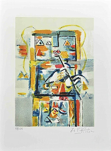 Robot è una litografia originale realizzata negli anni '80 da Ibrahim Kodra.Buone condizioni.Firmata a mano.Numerata. Edizione 59/125.L'opera d'arte è raffigurata attraverso tratti morbidi in una composizione ben equilibrata.