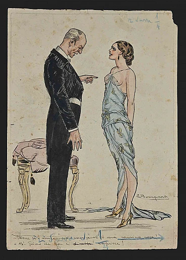 Camicia Nera è un disegno originale a inchiostro acquerellato su carta color avorio, realizzato negli anni '20 da Luigi Bompard (1879-1953). Firmato a mano a penna sul margine inferiore. In buone condizioni, tranne qualche piccola fioritura e piegatura. l'opera d'arte è raffigurata attraverso tratti morbidi in una composizione ben bilanciata.