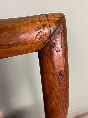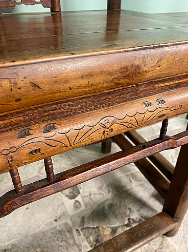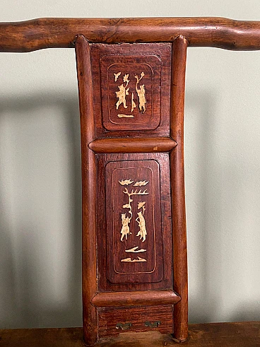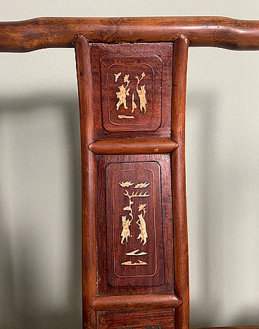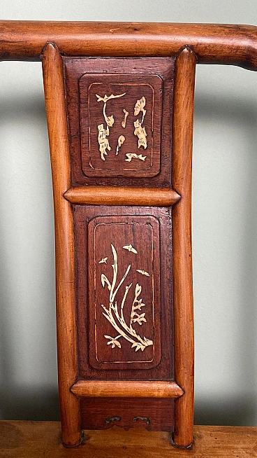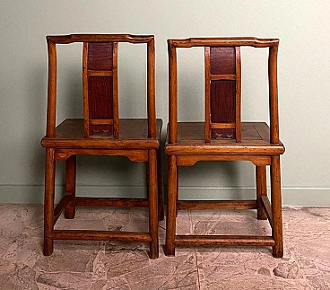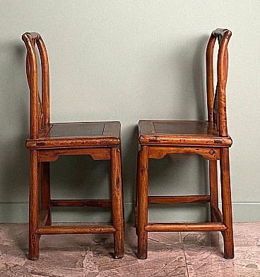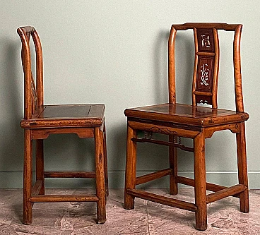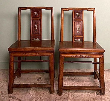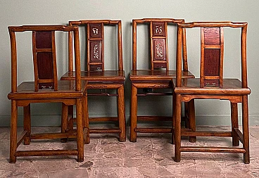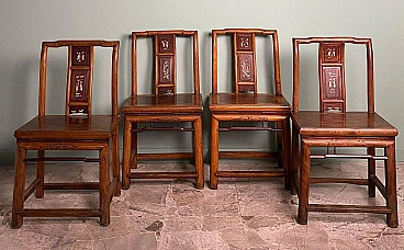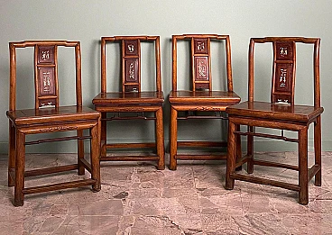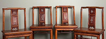 Set di quattro sedie da cerimonia cinesi stile dinastia Ming, fine '800. Questa serie di quattro bellissime e rare sedie da cerimonia cinesi presenta alcune caratteristiche uniche. È importante notare che due di esse hanno la stessa altezza, mentre le altre due sono leggermente più basse (vedi foto). Questa differenza non sminuisce il loro valore, anzi, aggiunge una caratteristica unica. Le due sedie più basse hanno intarsi identici sui pannelli dello schienale alto, mentre le sedie più alte hanno disegni diversi l'una dall'altra. I disegni a intarsio in legno chiaro, situati sui pannelli centrali di ogni sedia, sono racchiusi in un binario curvilineo. Per la loro forma generale, possono essere classificate come sedie da cerimonia. Le decorazioni a intarsio rappresentano simboli di buon auspicio e scene di fortuna e prosperità. Rispetto alle sedie normali, queste hanno sedute più larghe e una lavorazione più complessa, con diverse lastre di legno collegate da incastri senza l'uso di chiodi. I pannelli centrali degli schienali sono finemente decorati e curvati verso l'esterno per una seduta più confortevole. Le gambe sono spesse, massicce e leggermente svasate verso l'esterno per garantire una perfetta stabilità, assicurando che le sedie siano comode per le cerimonie più lunghe ed estenuanti. Queste sedie sono state realizzate tra il 1870 e il 1875, durante la dinastia Qing, ma in stile Ming. Sebbene precedente, lo stile Ming ha influenzato notevolmente la produzione successiva. Le sedie Ming sono caratterizzate da linee pulite, equilibrio e semplicità funzionale. È probabile che queste sedie siano state create in un laboratorio specializzato di Pechino, un importante centro di produzione di mobili noto per le sue sedie di alta qualità, spesso commissionate dalla nobiltà e dalla corte imperiale. Gli altri principali centri di produzione di sedie, Suzhou e Guangzhou, avevano caratteristiche che non si adattavano alle nostre sedie. Gli artigiani di Suzhou erano specializzati in dettagli e disegni intricati, mentre Guangzhou era nota per l'influenza del commercio internazionale, che ha portato a disegni più elaborati e decorati. Per quanto riguarda il legno, durante il periodo Ming si utilizzava l'Hanghuali (un raro e pregiato legno di rosa), apprezzato per la sua durezza e bellezza naturale. Queste sedie, tuttavia, sono state realizzate durante la dinastia Qing, quando si usava lo Zitan. Lo Zitan è un legno duro e denso con venature poco evidenti e una struttura fine, simile al legno di rosa, proveniente dall'Indocina e dall'isola di Hainan, molto apprezzato dagli artigiani cinesi e dalla loro esigente e raffinata clientela di nobili. Le sedie cinesi del XIX secolo presentano un'ampia varietà di stili e tecniche, che riflettono sia le tradizioni locali che le influenze esterne. L'artigianalità e la qualità rendono questi mobili non solo funzionali ma anche opere d'arte. Non abbiamo restaurato la struttura in legno delle sedie, poiché la loro patina superficiale e le piccole imperfezioni ne aumentano il fascino e ne attestano l'antichità e l'autenticità. Mancano alcune delle colonnine che distanziano la parte inferiore del sedile, con un piccolo tramezzo posto tra le due gambe anteriori. Non siamo riusciti a trovare il legno originale per sostituire i pezzi mancanti, quindi abbiamo preferito lasciare le sedie nelle loro condizioni originali. Altezza della seduta: 50 cm.