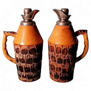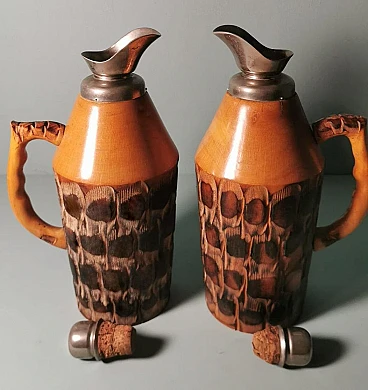 Coppia di brocche termiche di Aldo Tura per Macabo, anni '50. Questa originale e iconica coppia di brocche termiche presenta una struttura in robusto bambù asiatico, in parte levigato e in parte tagliato a cesello. All'interno si trova il componente termico in vetro argentato con una doppia cavità (vaso Sir James Dewar) e un tappo di sughero per la chiusura ermetica. Anche i manici sono realizzati con pezzi di bambù modellati a vapore. La parte metallica in alto, che si collega al bambù, è modellata a forma di becco per facilitare il versamento dei liquidi e vi si innestano i tappi di sughero. Le brocche sono state disegnate dal designer, creatore di mobili e decoratore d'interni italiano Aldo Tura (1909-1963) e prodotte tra il 1950 e il 1955 dall'azienda Macabo, da lui fondata nel 1939 a Cusano Milanino, in Lombardia. Lavorando tra le tendenze dell'Art Déco e del modernismo, Tura ha creato accessori di lusso e mobili unici caratterizzati da materiali ricchi, forme scultoree e tecniche artigianali esclusive. Nel dopoguerra, mentre molti produttori di mobili adattavano i loro metodi alla produzione di massa, Tura continuò a dedicarsi ai metodi artigianali tradizionali. Preferiva forme complesse e processi ad alta intensità di lavoro che non avrebbero mai potuto essere replicati su larga scala. Il suo mix di stili Art Déco e Art Nouveau con il design moderno e minimalista ha superato i confini dell'artigianato tradizionale. Nei suoi design utilizzava una vasta gamma di materiali insoliti come pelle di capra, bambù, gusci d'uovo, pergamena e impiallacciature di legno, impiegando i suoi colori più amati: giallo, rosso e verde. Tura si è guadagnato una reputazione internazionale non solo per l'uso innovativo dei materiali, ma anche per lo stile distintivo del suo lavoro, che spesso combina modernismo e artigianato tradizionale. Il Brooklyn Museum di New York ospita diverse opere di Tura, originariamente esposte nella mostra itinerante "Italy at Work: Her Renaissance in Design Today". Molti dei suoi prodotti sono veri e propri oggetti da collezione, in particolare creazioni come le nostre brocche rifinite in bambù. Come già detto, Tura non si è mai adattato al processo industriale, per cui i suoi oggetti sono ancora oggi in numero limitato sul mercato. L'azienda Macabo era un punto di riferimento per il design italiano dell'epoca. Era nota per la produzione di mobili, accessori per la casa e oggetti decorativi di alta qualità. I prodotti Macabo si distinguono per l'attenzione ai dettagli, l'artigianalità e l'uso di materiali pregiati. Aldo Tura e la sua azienda, Macabo, erano noti per l'uso innovativo di materiali, tra cui il bambù, scelti per le loro caratteristiche estetiche e fisiche. Il bambù utilizzato da Tura e dall'azienda Macabo, proveniente principalmente dall'Asia, veniva spesso scelto per la sua versatilità e per l'effetto visivo unico che poteva conferire a mobili e oggetti decorativi. Il bambù è noto per essere un materiale resistente e leggero con un aspetto estetico che può variare molto a seconda della lavorazione. L'uso del bambù ha permesso a Tura di creare pezzi unici che combinano bellezza, funzionalità e sostenibilità, contribuendo alla sua reputazione di innovatore del design italiano del XX secolo. Queste brocche hanno un design elegante e funzionale, che combina un'estetica lussuosa con l'utilità quotidiana.