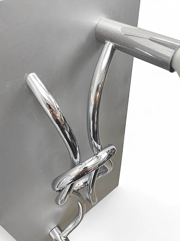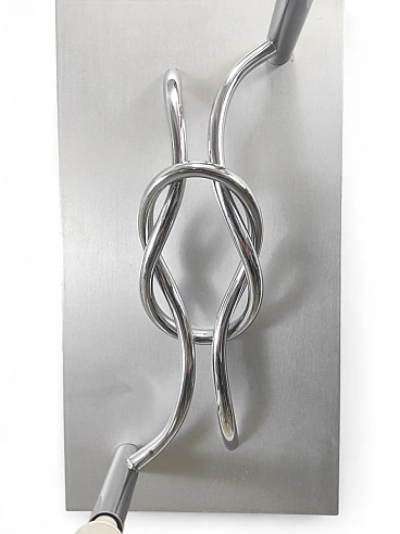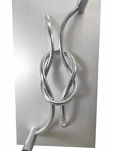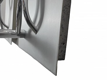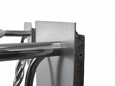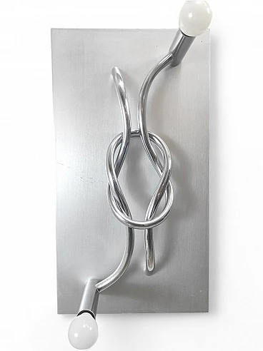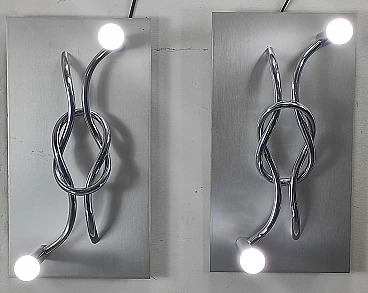 Coppia di applique in alluminio spazzolato e cromo, disegnate negli anni '70 da Giacomo Benevelli. Condizioni ottime, leggeri segni di usura dovuti al tempo (guarda foto). Dimensioni 55 x 30 x 3 cm (H x L x P).