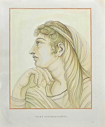Mary Sister Of Martha è un'acquaforte realizzata da Thomas Holloway per "Essays on Physiognomy, Designed to Promote the Knowledge and the Love of Mankind" di Johann Caspar Lavater, Londra, Bensley, 1810. Buone condizioni. Johann Caspar Lavater è stato un teologo e filosofo svizzero conosciuto in tutta Europa per i suoi studi sulla fisiognomica. Seguendo la tradizione fisionomica di Della Porta e di molti filosofi rinascimentali e barocchi, egli riteneva che il carattere di una persona potesse essere chiarito esaminandone le "linee del volto", tracciando cioè un ritratto abbozzato di profilo. Poter "leggere fuori" era il chiave per "conoscere l'interno". Il pensiero di Lavater influenzò ampiamente l'arte tra la fine del XVIII e l'inizio del XIX secolo, come nel caso di Johann Fuseli e William Blake (che realizzò due acqueforti per l'edizione inglese del suo Saggio di Lavater). poté dimostrare le sue teorie analizzando i ritratti di alcuni dei principali personaggi storici del passato, in alcuni casi tratti da dipinti o (soprattutto per l'antichità) da sculture. Alcune delle incisioni presenti nel suo volume, realizzate da grandi maestri dell'epoca, sono ancora considerati oggi capolavori grafici.