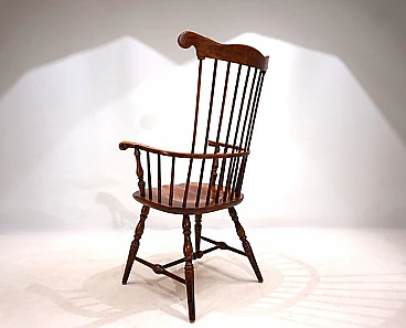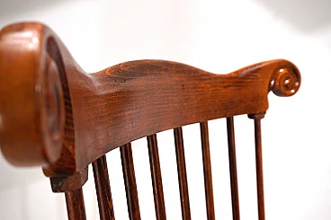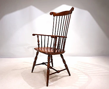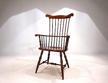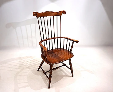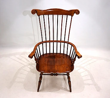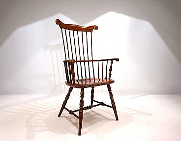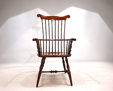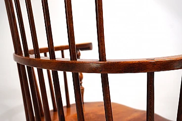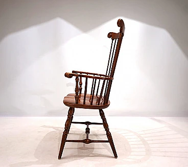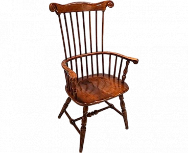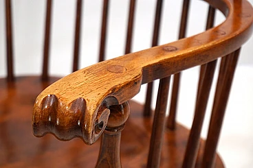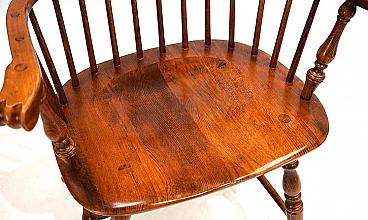 Poltroncina da capitano Windsor in olmo realizzata probabilmente in Inghilterra alla fine dell'800. Condizioni molto buone con una fantastica patina. L'elemento di design sui braccioli e sullo schienale e i montanti semplici e delicati conferiscono alla poltroncina un aspetto molto esclusivo. Il pezzo, realizzato in legno di olmo, ha sviluppato nel corso degli anni la sua patina e ha acquisito una tonalità color miele estremamente affascinante. Il legno dei montanti superiori esterni è stato in minima parte riparato sulle punte. Tutti gli elementi di giunzione sono solidi. Altezza della seduta: 47 cm. Profondità della seduta: 40 cm. Altezza dei braccioli: 72 cm.