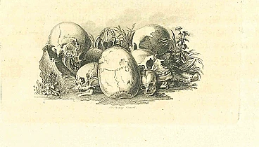 Skulls è un'acquaforte originale realizzata da Thomas Holloway per "Essays on Physiognomy, Designed to Promote the Knowledge and the Love of Mankind" di Johann Caspar Lavater, Londra, Bensley, 1810. Buone condizioni. Johann Caspar Lavater era un teologo e filosofo svizzero noto in tutta Europa per i suoi studi sulla fisiognomica. Seguendo la tradizione fisiognomica di Della Porta e di molti filosofi rinascimentali e barocchi, egli riteneva che il carattere di una persona potesse essere chiarito esaminandone le "linee del volto", tracciando cioè un ritratto di profilo. Poter "leggere fuori" era il chiave per "conoscere l'interno". Il pensiero di Lavater influenzò ampiamente l'arte tra la fine del XVIII e l'inizio del XIX secolo, come nel caso di Johann Fuseli e William Blake (che realizzò due acqueforti per l'edizione inglese del suo Saggio di Lavater). poté dimostrare le sue teorie analizzando i ritratti di alcuni dei principali personaggi storici del passato, in alcuni casi tratti da dipinti o (soprattutto per l'antichità) da sculture. Alcune delle incisioni presenti nel suo volume, realizzate da grandi maestri dell'epoca, sono ancora oggi considerati capolavori grafici.
