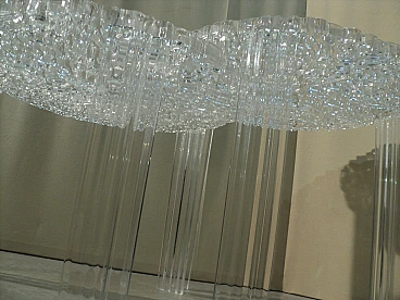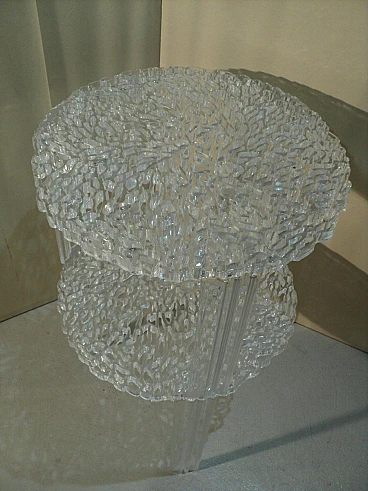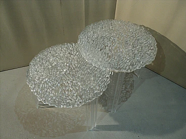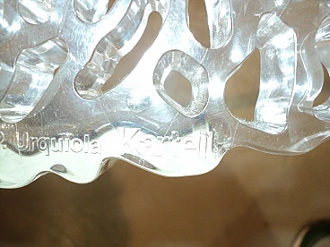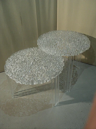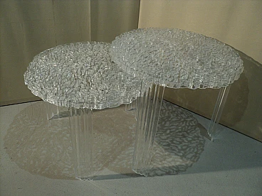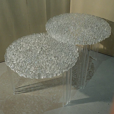 Una linea di tavolini nati dalla creatività di Patricia Urquiola unita alle potenzialità e al Know – how tecnologico di Kartell. Nascono dal desiderio di fare ricerca e innovazione sulle superfici per ottenere dei nuovi effetti sia visivi che tattili. Il piano del T-Table ha una superficie in cui si alternano pieni e vuoti che vanno a disegnare una decorazione elegante e preziosa simile ad un ricamo. Un oggetto di grande poesia, molto femminile, estremamente elegante che nasce dalla ricerca e dalla sperimentazione tecnologica. Qui è proposto in versione trasparente e in due differenti altezze. H. 44 cm, P. 50 cm; H. 36 cm e p. 50 cm.