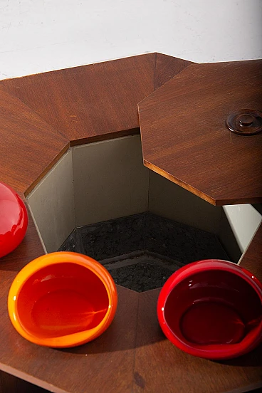 Tavolino con vano bar di Vittorio Gregotti, anni '60. Unendo perfettamente funzionalità e stile, questo pezzo si distingue per la sua audace struttura geometrica e i vivaci dettagli in ceramica, che lo rendono un must per gli appassionati di mobili unici. Realizzato nei vivaci anni '60, questo tavolo ha un aspetto accattivante con la sua base in legno e gli scomparti incassati, ciascuno dei quali funge da pratico ma elegante supporto per snack od oggetti decorativi. Il punto forte del suo design sono le "ciotole" in ceramica smaltata arancione che forniscono un'esplosione di colore, esaltando il fascino della tavola e fungendo anche da funzionali contenitori per snack. Una chicca nascosta all'interno di questo tavolino è il vano centrale chiuso da un coperchio azionato da una manopola. Questo spazio segreto, rivestito in metallo lucido, è ideale per riporre bottiglie o tesori, aggiungendo un elemento di sorpresa che sicuramente stimolerà la conversazione. Nonostante presenti lievi segni di usura che testimoniano la sua età e la sua ricca storia, il tavolino rimane in buone condizioni, preservando l'integrità e il fascino del suo design originale.