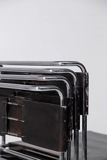Set di quattro sedie Libellula di Giovanni Carini per Planula, anni '70. Sono celebrate per il loro design minimalista ma funzionale, caratterizzato da sedili e schienali composti da due fasce di elegante pelle nera, elegantemente tese su una struttura in tondino di acciaio cromato. Le sedie sono conservate nelle loro condizioni originali vintage, hanno segni di usura naturale sulla pelle che aggiungono carattere ma sono prive strappi. La finitura cromata della struttura in acciaio fornisce uno straordinario contrasto con la pelle opaca, migliorando il fascino visivo di questi pezzi iconici. Perfette per una varietà di ambienti, dagli uffici moderni agli interni domestici eclettici, offrono stile e un pezzo di storia.