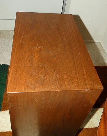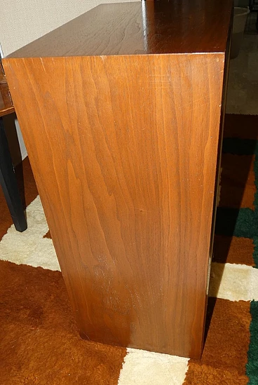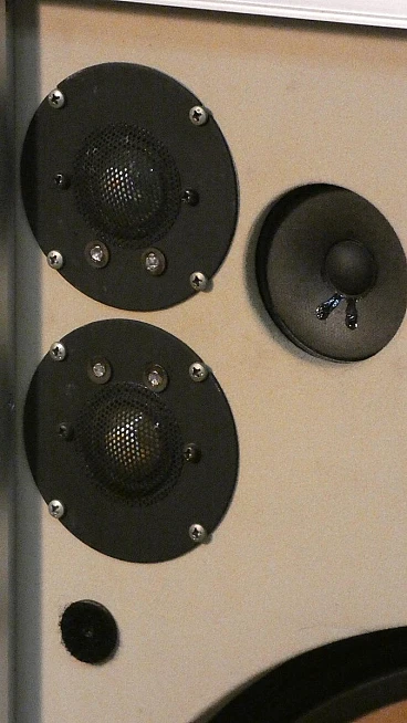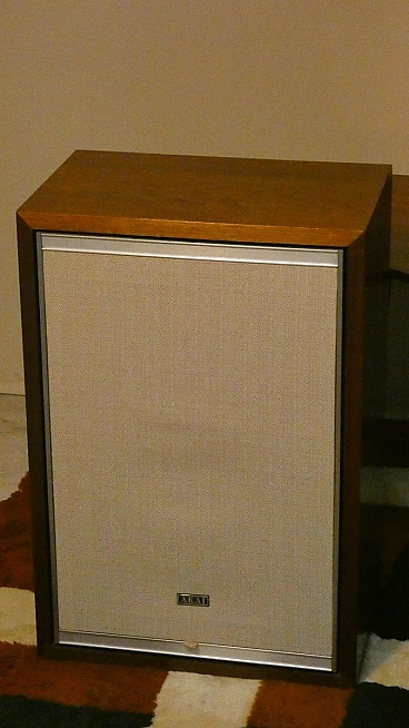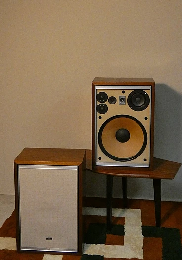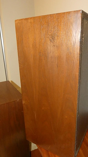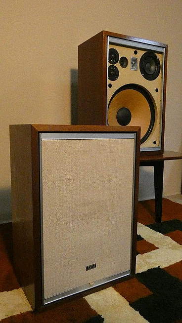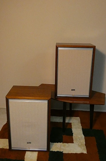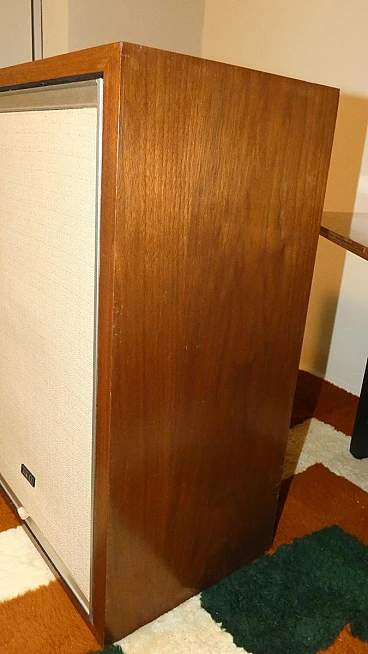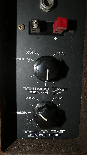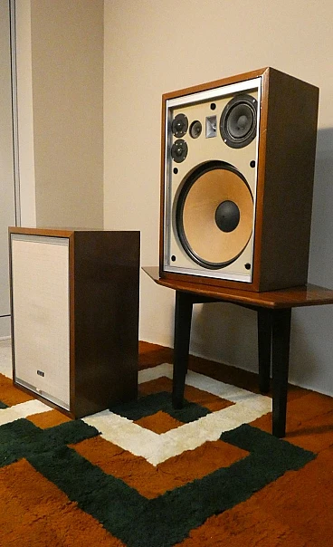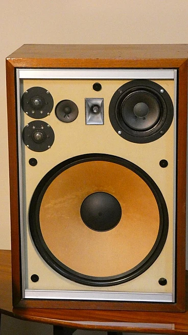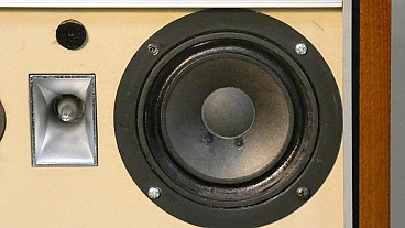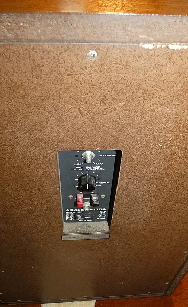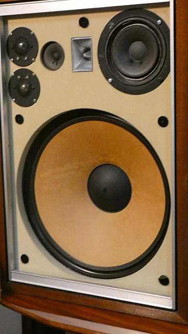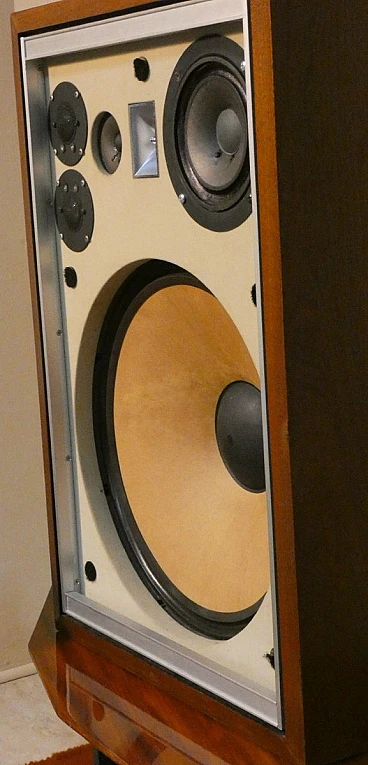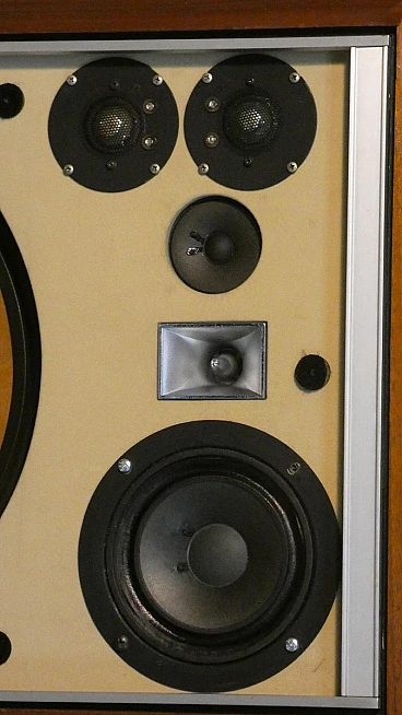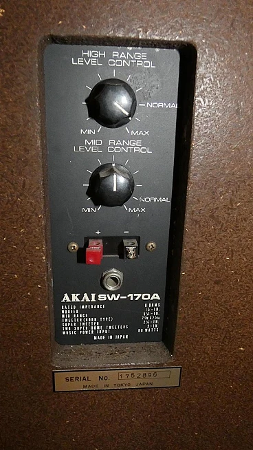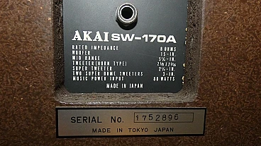 Nella gamma bassa è installato un woofer a cono da 38 cm. Questa unità utilizza un bordo L. T. P (Linear Travel Piston Edge) con una flessibilità moderata per abbassare la frequenza di risonanza più bassa e ridurre la distorsione. Inoltre, sopprimendo la riflessione delle onde sonore dal bordo o dalla carta del cono a causa dell'ampiezza, si riduce il disturbo delle caratteristiche di frequenza. Lo skoker a cono da 13 cm è montato nell'area centrale. Questa unità utilizza carta a cono bianca con un nuovo materiale leggero sul bordo e una cavità posteriore per ridurre le interferenze con il woofer. Nella gamma alta è installato un tweeter da 5,4x6,1 cm. La qualità del suono è migliorata da un potente circuito magnetico e da un equalizzatore su larga scala. Nella banda super alta sono installati un super tweeter a cono da 7,5 cm e due super tweeter a cupola con un diametro unitario di 8,3 cm. Il tweeter a cupola di nuova concezione migliora le caratteristiche direzionali su un'ampia area. Il baffle anteriore è dotato di peli di nylon bianco avorio piantati sulla superficie del compensato per migliorare l'assorbimento acustico ed eliminare il suono fangoso. Inoltre, la rete della griglia anteriore può essere rimossa con un nastro magico. L'involucro è realizzato con una combinazione di compensato Homo gen e Lauan con travi rinforzate per ridurre il rimbombo della cassa e l'esterno è rifinito con olio di noce. I controlli di livello sono previsti per i segnali di gamma media e alta. Oltre al terminale generale per i diffusori, è presente un terminale di tipo jack. - Produttore: Akai - Modello: SW-170 A - Anni di produzione: 1970 - 1972 - Prodotto in: Giappone - Colore: Noce - Dimensioni (LxHxP): 425 x 620 x 280 mm - Peso: 22,5 kg (set totale 45 kg) - Costruzione: 5 vie, 6 altoparlanti, chiuso CUSCINO: - Woofer: cono da 380 mm - Driver midrange: cono da 130 mm - Tweeter: 1x 54 mm, 1x 63 mm - Super tweeter: 1x 75 mm, 1x tromba 87 mm - Gestione della potenza (nominale/musicale): 50 W / 80 W - Risposta in frequenza: 20 - 23'000 Hz - Efficienza: 103 dB / W / 0,5 m - Gamme di transizione: 600 Hz, 5'000 Hz, 10'000 Hz, 15'000 Hz - Impedenza: 8 Ohm CARATTERISTICHE SPECIALI: - Frontale rimovibile - Controllo di livello sul pannello posteriore per le frequenze medie e alte - Collegamento degli altoparlanti anche con spina jack da 6,3 mm.