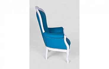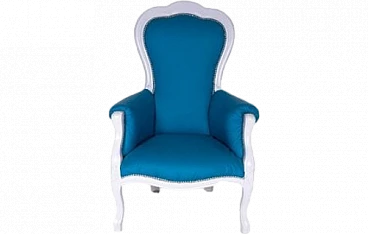 Questa poltrona vintage in stile barocco è un perfetto connubio tra eleganza e comfort. La struttura in legno intagliato bianco offre un raffinato contrasto con la vivace tappezzeria blu. Le borchie decorative lungo il profilo aggiungono un tocco di classe.
