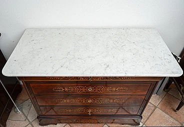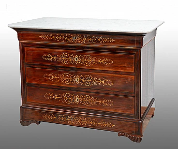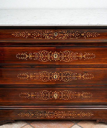 Cassettone Carlo X francese in legno esotico pregiato con piano in marmo bianco statuario, '800. Il prospetto principale è caratterizzato da tre grandi cassetti e uno più piccolo sottopiano sgusciato verso l'alto. I tre cassetti sono impreziositi da intarsi a motivo vegetale e racemi, mentre il cassetto sottopiano e la base hanno un intarsio con lo stesso motivo. La base rettilinea collega due piedi con una forma particolare tipica dello stile Carlo X. Restaurato dai nostri maestri artigiani con metodo tradizionale gommalacca e alcool fatto a mano. Completo di certificato di autenticità. Siamo a vostra disposizione per ulteriori chiarimenti o particolari fotografici. Spedizione in tutta Italia, Europa e Resto del Mondo in massima sicurezza e tracciabile. La spedizione sarà concordata privatamente.