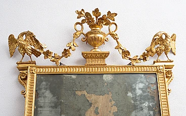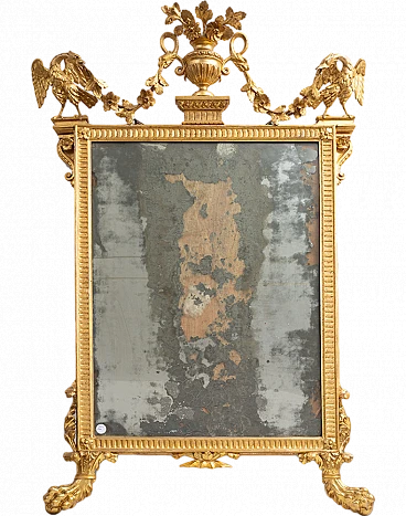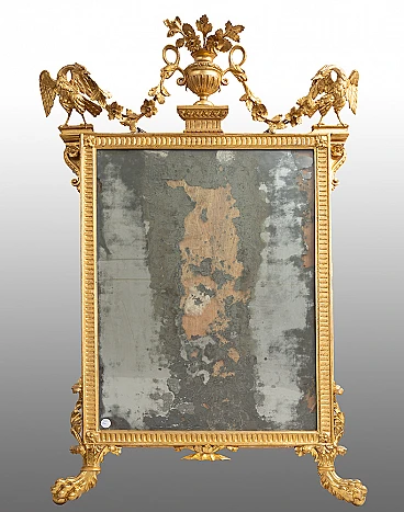 Elegante specchiera Luigi XVI napoletana della seconda metà del '700, interamente scolpita, intagliata e dorata a foglia oro. Vetro al mercurio originale e cornice lignea riccamente intagliata e dorata. La cimasa, avente una forma di un anfora con fiori, è molto slanciata verso l’alto e alleggerisce la ricchezza degli ornati rendendo l’insieme leggiadro e ben equilibrato. Due draghi laterali vanno a impreziosire ulteriormente la parte superiore, mentre in quella inferiore la specchiera poggia su piedi ferini anch’essi dal ricco intaglio e decori floreali. Le volute e il movimento dell’elaborata architettura di questa specchiera la rendono un oggetto particolarmente di pregio, contraddistinto da un bell'intaglio a racemi e fiori, tipici del periodo di appartenenza. Completa di certificato di autenticità. Siamo a vostra disposizione per ulteriori chiarimenti o particolari fotografici. Spedizione in tutta Italia, Europa e Resto del Mondo in massima sicurezza e tracciabile. La spedizione sarà concordata privatamente.