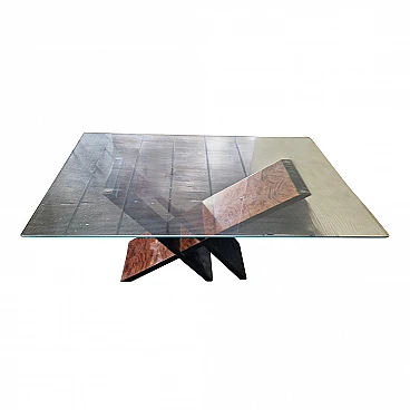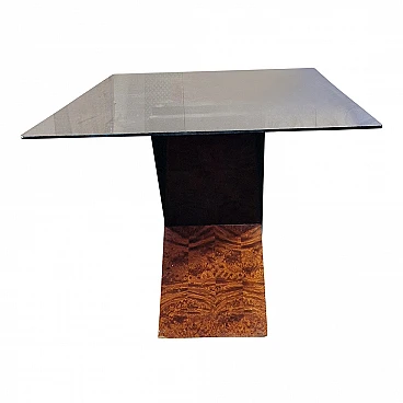 Tavolo in legno laccato nero e radica con piano in vetro, anni '90
