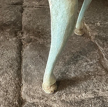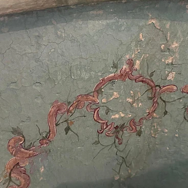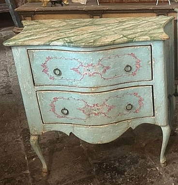Lo stile Luigi XV fu un movimento di design che fiorì durante il XVIII secolo. Era caratterizzato da mobili ornati e aggraziati con linee curve, dettagli intricati e un'attenzione particolare all'asimmetria. Questo stile era noto per la sua eleganza e opulenza, con elementi decorativi come motivi rococò e motivi floreali. Nel corso del XIX secolo ci fu una rinascita dell'interesse per gli stili precedenti e vari revival storici. La cassettiera ha fronti e lati curvi che le conferiscono un aspetto elegante e stravagante. L'uso della lacca azzurra con motivi floreali rosa e verdi era tipico dello stile Luigi XV, il piano in legno è decorato con finto marmo verde. Le gambe ricurve che terminano con una zampa di capra, aggiungono un senso di