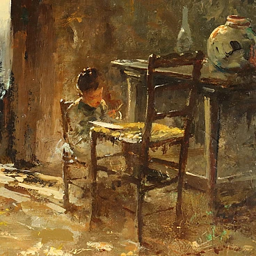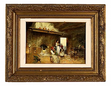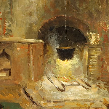 Olio su tela. La scena è ambientata all'internodi un casolare popolare: davanti al grande camino, ove sopra il fuoco bolle il pentolone,