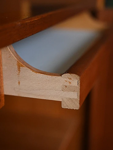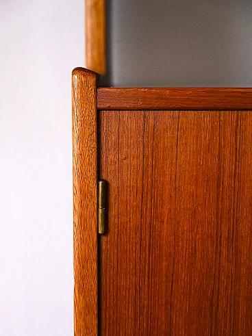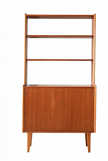Libreria scandinava in teak anni '60. La parte inferiore presenta un ampio vano chiuso da due ante a battente, mentre la parte superiore è suddivisa in due sezioni: due scaffalature a giorno e due piccoli cassettini. Il design essenziale e le linee pulite, tipiche dello stile nordico, rendono questo mobile adatto a diversi ambienti, donando un tocco di raffinata eleganza. La struttura robusta e l'utilizzo di materiali di alta qualità garantiscono una lunga durata nel tempo, rendendolo un investimento intelligente per arredare con gusto la propria casa. Questo mobile libreria scandinavo in teak è un pezzo d'arredo che combina perfettamente estetica e funzionalità, creando un ambiente ordinato e piacevole alla vista. Buone condizioni. È stato fatto un restauro conservativo utilizzando materiali naturali. Potrebbe presentare dei segni del tempo. Per piacere presta attenzione alle fotografie.