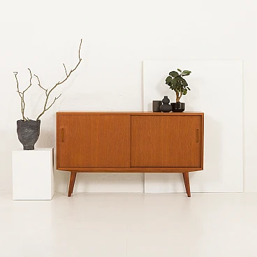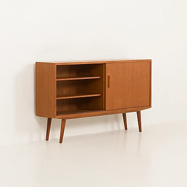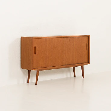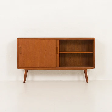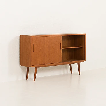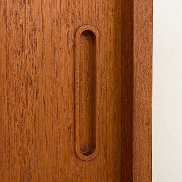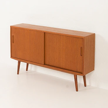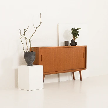 Credenza in teak di Hundevad (Danimarca), anni '60. Ricorda molto da vicino i progetti di Carlo Jensen per Hundevad & Co. dello stesso periodo. I progetti di Jensen spesso incorporavano caratteristiche innovative e forme pulite e geometriche, fortemente influenzate dai movimenti di design modernista della metà del '900. Questa credenza in teak presenta linee pulite, un design minimalista ed eleganza funzionale, che si adattano perfettamente alla filosofia di design di Jensen. È costruita in legno di teak ricco e caldo, noto per la sua durabilità e le belle venature. Il design comprende ante scorrevoli e due ampi scomparti con ripiani regolabili, fornendo ampio spazio di archiviazione pur mantenendo un aspetto elegante e ordinato. È un vero esempio di artigianato danese di alta qualità. La credenza è stata rinnovata e sono stati applicati nuovi strati di olio danese. Dopo questo restauro è tornata al suo pieno splendore e arricchirà ogni tipo di interno per i prossimi decenni. Altezza da terra: 23 cm.