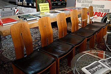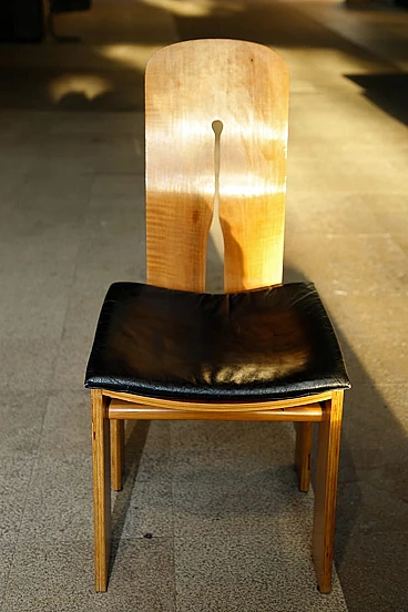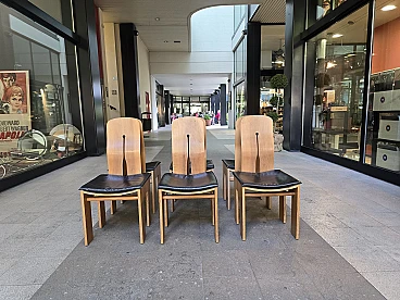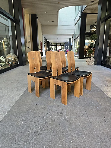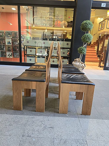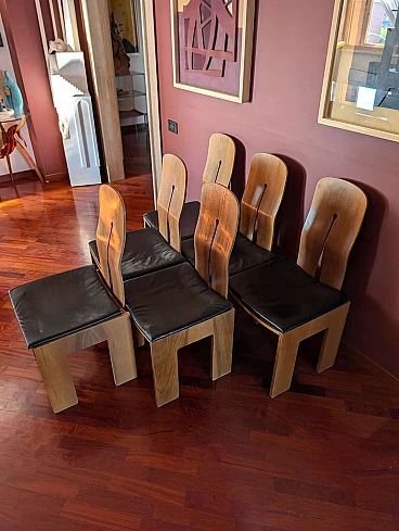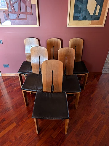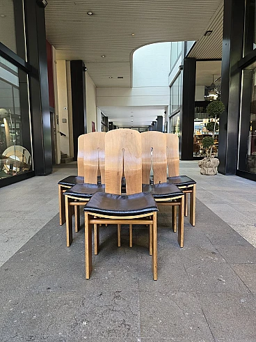 Set di sei sedie mod. 1937-765 in pelle nera e legno di Carlo Scarpa per Bernini, anni '70 (1977). Ogni pezzo rappresenta la capacità di Scarpa di trasformare oggetti di uso quotidiano in opere d'arte funzionali. Le sedie sono costruite con compensato e legno, garantendo la loro durata e aggiungendo un elemento caldo e naturale alla loro estetica.