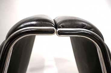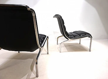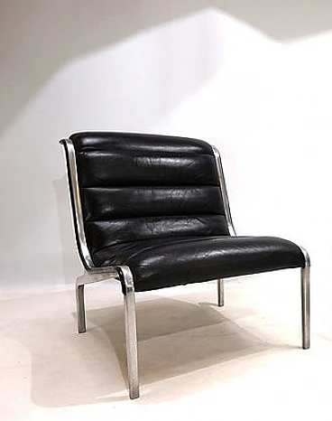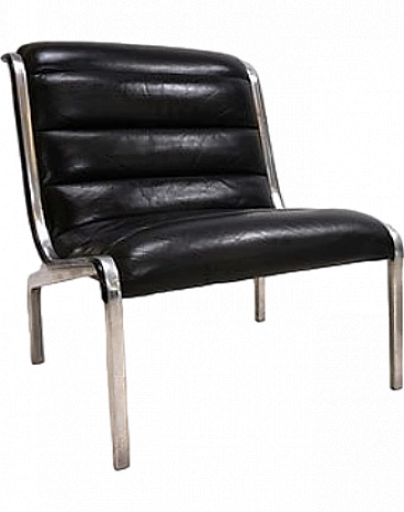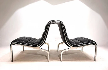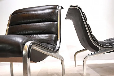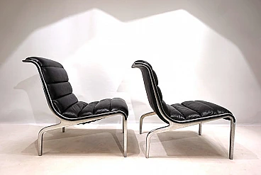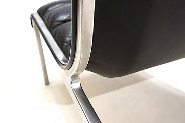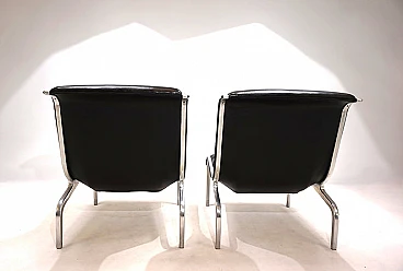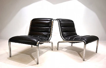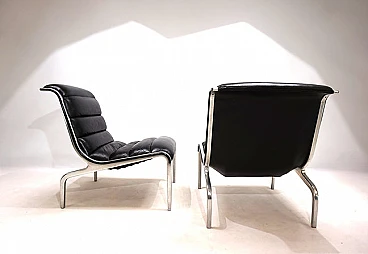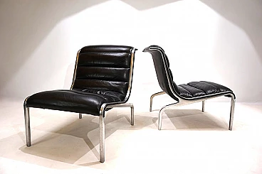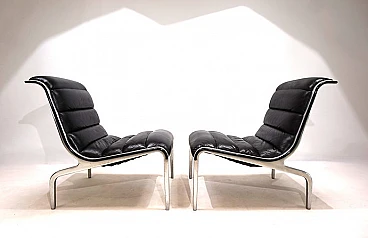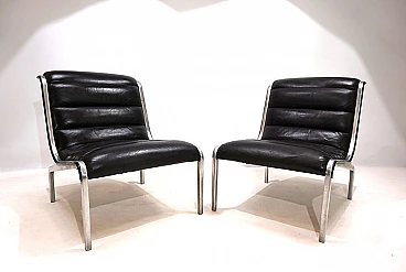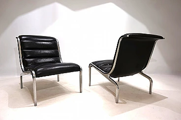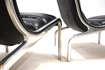 Queste due poltrone in pelle dimostrano, con il loro stile moderno e senza tempo, quanto fossero in anticipo sui tempi i design degli anni Settanta. La pelle nera delle poltrone è molto morbida, di alta qualità e presenta una patina minima. Le cornici in alluminio spigoloso sono dotate di un bordino in plastica più largo che conferisce alla vista laterale un certo dinamismo. Le cornici presentano lievi segni di usura e patina.