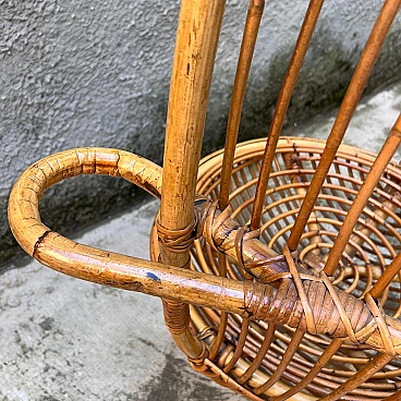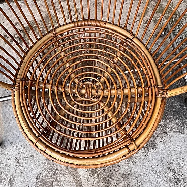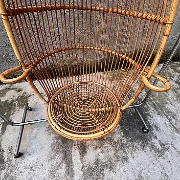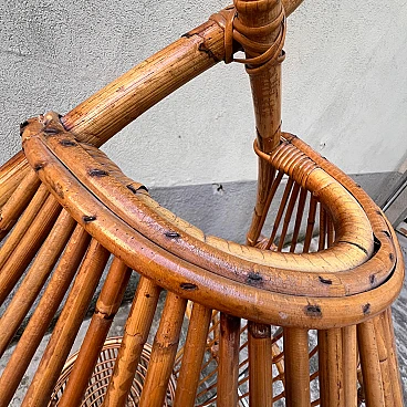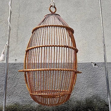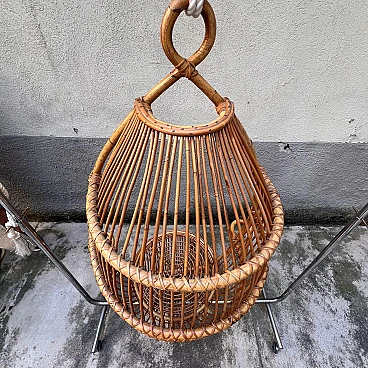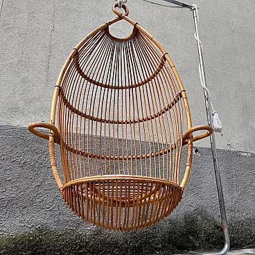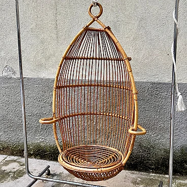 Poltrona sospesa in bambù di Fratelli Castano, anni '50. La struttura presenta una forma a goccia, con sottili listelli di bambù intrecciati che formano il sedile e lo schienale. La poltrona è sospesa tramite una robusta corda bianca. Il design semplice ed elegante riflette lo stile tipico degli anni '50, caratterizzato da linee pulite e materiali naturali. Utilizzabile all'aperto o all'interno. I Fratelli Castano erano rinomati artigiani italiani specializzati nella lavorazione del bambù e del rattan. Negli anni '50, il loro lavoro si distinse per l'innovazione nel design e per l'uso di tecniche artigianali che valorizzavano la bellezza naturale dei materiali. La loro produzione comprendeva mobili sospesi, sedie, tavoli e complementi d'arredo, tutti caratterizzati da un'elevata qualità costruttiva e un'estetica raffinata. Il lavoro dei Fratelli Castano è oggi molto apprezzato dai collezionisti e dagli appassionati di design vintage per la sua unicità e per l'abilità artigianale che testimonia. Altezza della seduta: 46 cm.