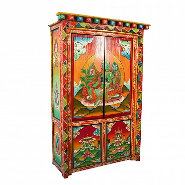 Mobile Etnico anni 60 Nord Corea, in legno e decorato completamente a mano, usando una pittura terra naturale. Da notare anche gli intarsi nel legno. La credenza è dotata di 4 ante e 5 ripiani. In buone condizioni con normali segni del tempo come da foto.