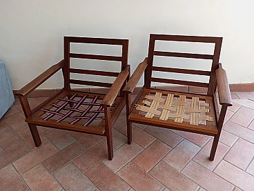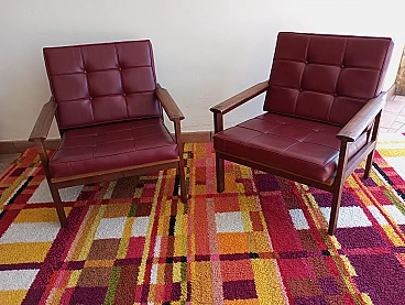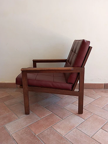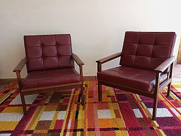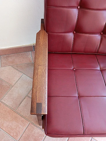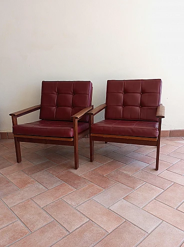 Coppia di poltrone di Illum Wikkelsø per Niels Eilersen, anni '60. Queste poltrone, realizzate per la collezione Cappell, rappresentano un esempio notevole di design vintage con le loro linee essenziali e pulite. La struttura in teak di alta qualità conferisce robustezza e durabilità, tipiche del design scandinavo di quel periodo. La struttura mostra una finitura levigata e naturale, mettendo in risalto la bellezza del legno e le sue venature caratteristiche. I cuscini, originariamente imbottiti per garantire il massimo comfort, sono rivestiti in pelle autentica. Col tempo, la pelle ha sviluppato una patina che aggiunge carattere e fascino a queste poltrone, rendendole pezzi unici. Tuttavia, si notano alcuni bottoni mancanti sui cuscini, un dettaglio che, pur non compromettendo la funzionalità delle poltrone, testimonia la loro storia e l'uso che ne è stato fatto nel corso degli anni. Queste poltrone incarnano l'eleganza minimalista degli anni '60, combinando la semplicità del design con materiali di alta qualità, rendendole perfette per chi apprezza l'estetica vintage e la maestria artigianale dell'epoca. Altezza della seduta: 31 cm. Il designer danese Illum Wikkelsø (1919–1999) diceva che i mobili dovevano essere costruiti con materiali di alta qualità per durare nel tempo, dovevano accogliere il corpo comodamente e naturalmente piacere all'occhio. Studiò da ebanista e così iniziò la sua carriera lavorando per famosi architetti. Profondo conoscitore dei migliori materiali, aprì un suo studio e firmò diverse collezioni diventando così un protagonista del design danese a livello internazionale. Niels Eilersen aprì il suo laboratorio nel 1895 e iniziò producendo carrozze; fu la prima persona in Danimarca a usare il vapore per curvare il legno. Con l’arrivo del motore a scoppio e delle prime automobili iniziò a realizzare carrozzerie fatte a mano, iniziando successivamente a produrre sedie lineari in collaborazione con molti designer.