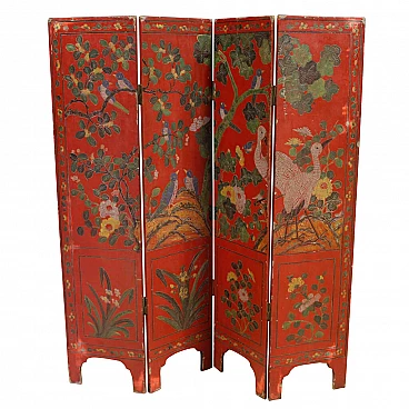 Paravento francese a chinoiserie. Mobile in legno e gesso laccato e dipinto con motivi floreali e scene popolari a cineseria. Paravento della metà XX secolo composto da quattro pannelli finiti da centro, ideale da inserire in una camera o salotto. Presenta diversi segni di usura e cadute di colore, nel complesso in discreto stato conservativo.