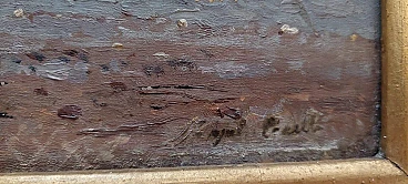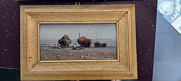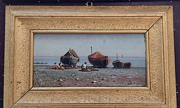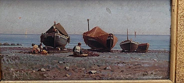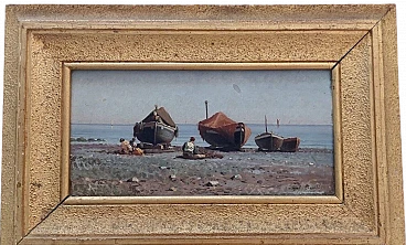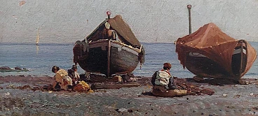 Dipinto a olio su tavola di Augusto Corelli (Roma 1853 - 1918) raffigurante dei pescatori a Napoli, fine '800. Firmato in basso a destra "Napoli Corelli". Cornice coeva. Misure senza cornice: 17 x 35 cm. Nacque a Roma da Eugenio Corelli e Mary Ann Parry (nata nel 1822 a Lugwardine, villaggio dell'Herefordshire in Inghilterra). Augusto è il quinto di sei figli: Edoardo, Filippo, Clemente, Giulia e Giuditta. Si formò artisticamente presso l'Accademia di San Luca a Roma, dove si diplomò all'età di diciotto anni. Fu allievo del pittore napoletano Achille Guerra. Frequentò a Roma l'Accademia di Giggi in Via Margutta, che era stata fondata da un modello per lo studio dal vero della figura umana e costituiva all'epoca un punto di ritrovo per i più rinomati artisti anche stranieri. Nel 1879 si trasferì a Parigi dove rimase solo alcuni mesi poiché non trovò l'ambiente confacente alla sua visione artistica. Egli, infatti, era attratto soprattutto dal paesaggio e dal mondo rurale montano. Tornato in Italia, a Roma, iniziò a viaggiare nel Lazio e in Abruzzo alla ricerca di soggetti che ispirassero la sua sensibilità artistica. Nel 1880, mentre percorreva la via Tiburtina Valeria alla volta dell'Abruzzo in compagnia del suo allievo, il pittore Domenico Pennacchini (suo futuro cognato), la diligenza sulla quale viaggiavano fece sosta presso il fiume Aniene di fronte al paese di Anticoli Corrado. Il Corelli nelle sue memorie narra di essere stato attratto da questo paese arroccato sopra a un promontorio, decidendo così di fermarvisi. Fu ammaliato dalla bellezza dei suoi abitanti e dagli scorci paesaggistici. Iniziò in questo luogo un febbrile lavoro pittorico tornandovi più volte e reclutando come modelli gli anticolani, molti dei quali, da lì a pochi anni, diventarono modelli professionisti. A Roma raccontò con entusiasmo ai suoi amici artisti di questo paese che aveva scoperto. Quest'ultimi incuriositi iniziarono a visitare Anticoli rimanendone anch'essi affascinati, tantoché nel giro di qualche anno vi si creò una nutrita colonia artistica. Il Corelli fu il primo che costruì ad Anticoli un vero e proprio studio artistico come afferma il pittore Orazio Amato. Lo stesso Amato compose l'epigrafe, incisa su una lastra di marmo apposta sulla facciata dello studio, che così recitava: "Cui primo arrisit sylvestris horum montium poesis, Augustus Corelli, civis romanus hanc domum artis cultui sacram, Anno 1884, posuit". Tale edificio verrà abbattuto nel 1950 per far posto ad una strada comunale.