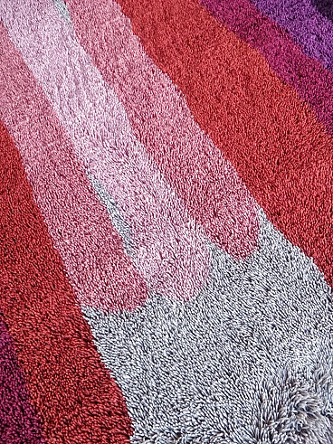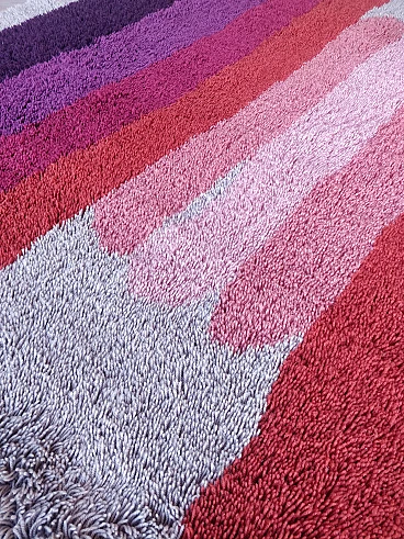Questo tappeto vintage degli anni '70 prodotto da Desso (Paesi Bassi) è un pezzo iconico di design pop art di quel periodo. A pelo alto con un fondo bianco che crea una base luminosa e pulita. Dal disegno moderno con strisce colorate, le scalature viola, rosa e blu sono il suo dettaglio distintivo, aggiungono profondità e fascino al design complessivo, e creano un contrasto intrigante con il bianco del fondo. Il tappeto è realizzato con una tecnica di alta qualità in lana acrilica, che crea una sensazione di calore e comfort sotto i piedi, e perfetta per arricchire qualsiasi ambiente con il suo carattere distintivo e la sua bellezza senza tempo. In ottime condizione, è una rarità la sua dimensione quadrata 195 x 195 cm.