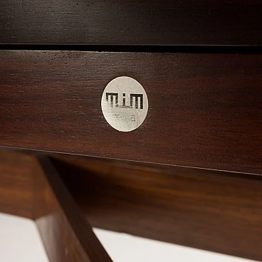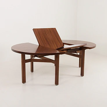 Questo tavolo da pranzo rotondo in palissandro è stato disegnato nel 1958 da Ico e Louisa Parisi per MIM (Mobili Italiani Moderni). Conosciuto come modello Olbia, questo tavolo è un pezzo notevole di mobili moderni metà secolo. Ico Parisi, rinomato architetto e designer italiano, ha spesso collaborato con la moglie Louisa, fondendo design innovativo con un'impeccabile maestria artigianale. Il modello Olbia riflette il loro stile distintivo, caratterizzato da linee eleganti, forme eleganti e un uso armonioso dei materiali. La lavorazione del tavolo Olbia è esemplare. Il palissandro utilizzato nella sua costruzione è apprezzato per il suo ricco colore e durata. La superficie meticolosamente lavorata, evidenziata dall'impiallacciatura in palissandro con motivo a stella stellata e posata con precisione, mette in risalto la bellezza naturale del legno. Le robuste gambe dal design geometrico, unite da strutture in legno curvate, creano una base visivamente suggestiva e strutturalmente solida. Questa combinazione di caldo palissandro e la base dalla forma interessante, insieme all'aggiunta di piedi in metallo fresco, aggiunge un tocco di modernità alle radici del tavolo metà secolo. Uno degli aspetti unici del tavolo è il meccanismo di estensione innovativo e pratico che esemplifica l'impegno della Parisi nel creare design adattabili e duraturi. Il sistema è integrato nel design in modo intelligente. Il piano del tavolo è costituito da due metà che si staccano, rivelando una foglia in due parti nascosta immagazzinata all'interno della struttura. La parte del foglio supplementare può essere sollevata e con una semplice trazione, la seconda parte del foglio si estende automaticamente, trasformando efficacemente il tavolo da una forma rotonda compatta a una forma ovale allungata. Questa attenzione alla forma e alla funzione, unita all'utilizzo di materiali pregiati, fa del tavolo Olbia una vera icona del design. Il nostro team ha controllato la tabella. Nonostante il passare del tempo, rimane in ottime condizioni originali e l'autenticità della sua origine è confermata dal timbro del produttore. Il piano del tavolo ha una nuova lacca, che aggiungerà altri diversi decenni di utilizzo. Un pezzo senza tempo che rimane attuale e di stile anche decenni dopo la sua creazione. Ancora pienamente funzionale. Abbiamo una serie di sedie dalla stessa casa e lo offriamo come un set pure. Dimensioni aggiuntive: altezza dal suolo 70 cm, larghezza delle foglie aggiuntive 70 cm.