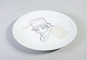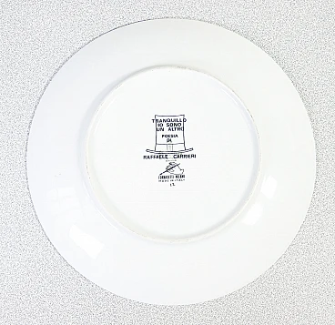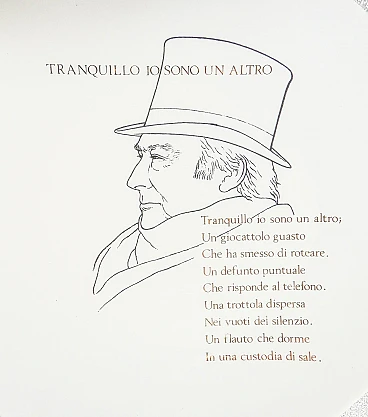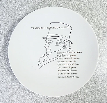 Piatto da collezione, design Fornasetti "Tranquillo io sono un altro" di Raffaele Carrieri. Italia anni '60. La poesia è di Raffaele Carrieri, poeta, scrittore, critico d'arte e giornalista italiano. Nato nel 1905 a Taranto, Carrieri ha avuto un ruolo attivo nella scena culturale italiana del Novecento, distinguendosi per la sua poliedricità e il suo contributo in vari campi delle arti e della letteratura. Carrieri è particolarmente noto per il suo lavoro nel campo della poesia e per i suoi scritti su arte e artisti. Ha collaborato con numerosi periodici e riviste, contribuendo significativamente al dibattito culturale del suo tempo. Oltre alla poesia e al giornalismo, Carrieri ha scritto diversi testi critici sull'arte, ponendo particolare attenzione ai movimenti artistici contemporanei e agli artisti emergenti. La sua opera è stata apprezzata per la capacità di fondere sensibilità poetica e acume critico, rendendolo una figura di spicco nel panorama culturale italiano del ventesimo secolo. Raffaele Carrieri è deceduto nel 1994. Porcellana serigrafata. Ø 24 cm, H 2.5 cm. Il piatto è in ottime condizioni, come è possibile constatare dalle foto allegate. Valutare attraverso le foto allegate.
