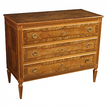 Comò italiano del XX secolo. Mobile in stile Luigi XVI riccamente intarsiato con decori geometrici in legni di noce, mogano, bois de rose, acero e legni da frutto. Cassettone munito di tre cassetti frontali di ottima capacità completi di tre chiavi funzionanti. Piano superiore ligneo in carattere di buona misura e servizio adornato da lastronatura su bordo frontale in legno di testa. Comò sorretto da quattro piedi a tronco di piramide rovesciata anch'essi intarsiati (vedi foto). Mobile di grande eleganza e carattere, in buono stato conservativo.
