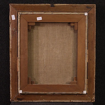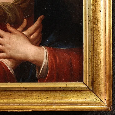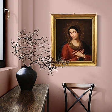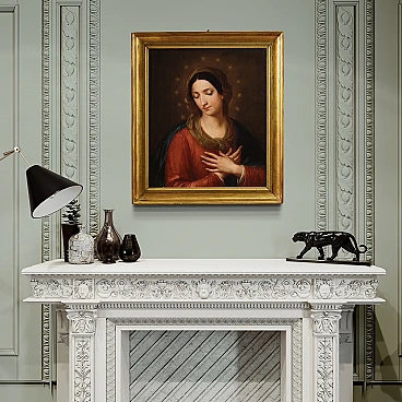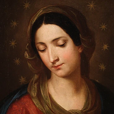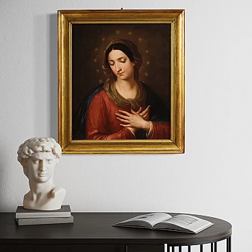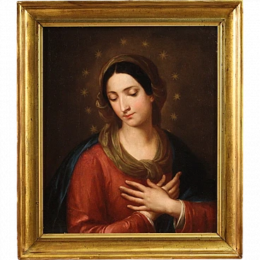 Quadro italiano religioso della prima metà dell'800. Opera a olio su tela raffigurante una bellissima Madonna, di ottima mano pittorica. Viene rappresentata con le braccia incrociate all'altezza del petto in un gesto che indica l'accettazione senza condizioni della volontà divina, mentre le dodici stelle sul suo capo rimandano a una simbologia mariana, ovvero l'immacolata concezione. Cornice coeva in legno intagliato e dorato, di bella decorazione, con alcuni segni del tempo. Opera già restaurata con rintelo, sostituzione del telaio e ripresa del colore in alcuni piccoli punti. Quadro nel complesso in buono stato conservativo. Misure senza cornice: 57 x 48 cm.