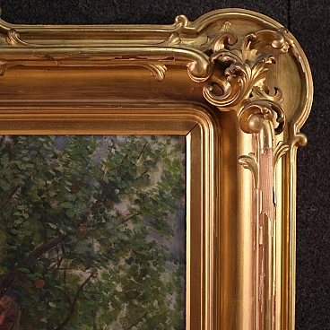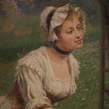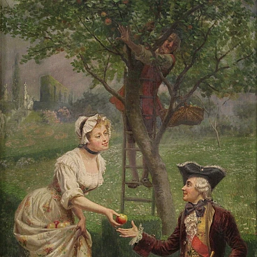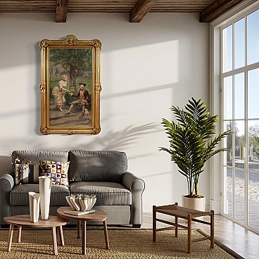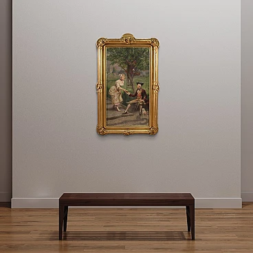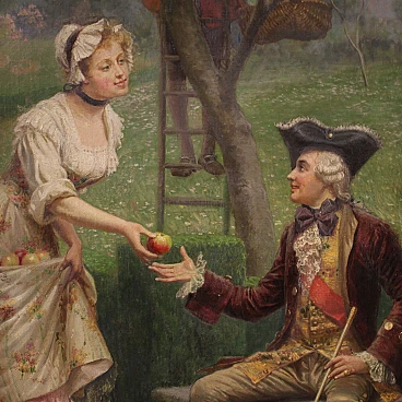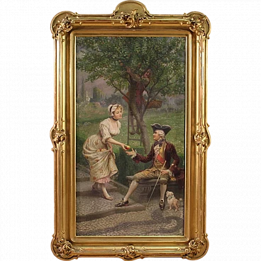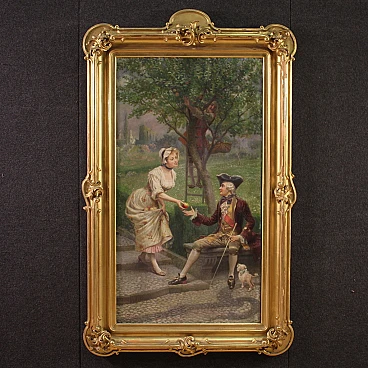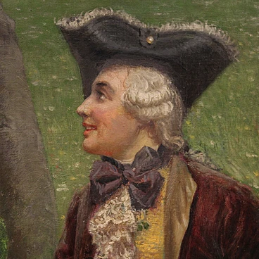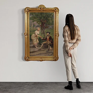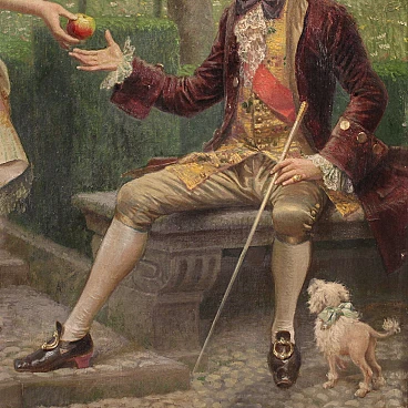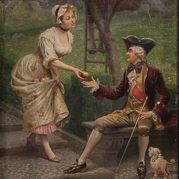 Grande dipinto della seconda metà dell'800. Opera a olio su tela, in prima tela, firmata "G. Mantegazza" e quindi attribuibile al pittore Giacomo Mantegazza; mancante di autentica. Introdotto alla pittura da Domenico Induno, lavorò in Lombardia in un periodo in cui la pittura di genere incrociava il Verismo. Fu uno dei pittori italiani più noti per le scene in costume settecentesco e questo dipinto ne è un chiaro esempio. Vediamo infatti una scena galante con personaggi in abiti settecenteschi dal grande fascino. Spettacolare cornice coeva in legno intagliato e dorato, con alcune piccole mancanze e cadute di doratura (vedi foto). Opera nel complesso in buono stato conservativo. Misure senza cornice: 113 x 62 cm.